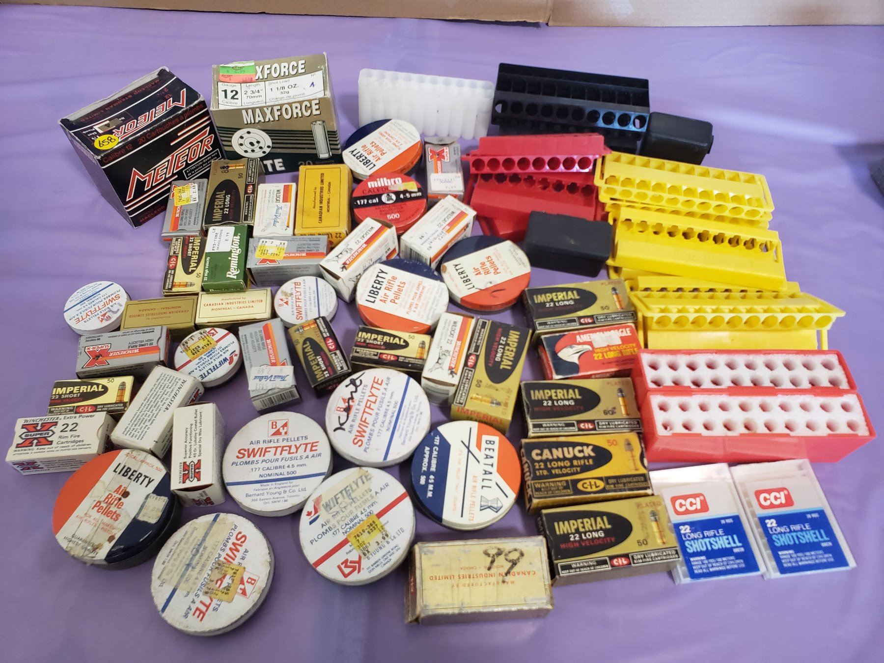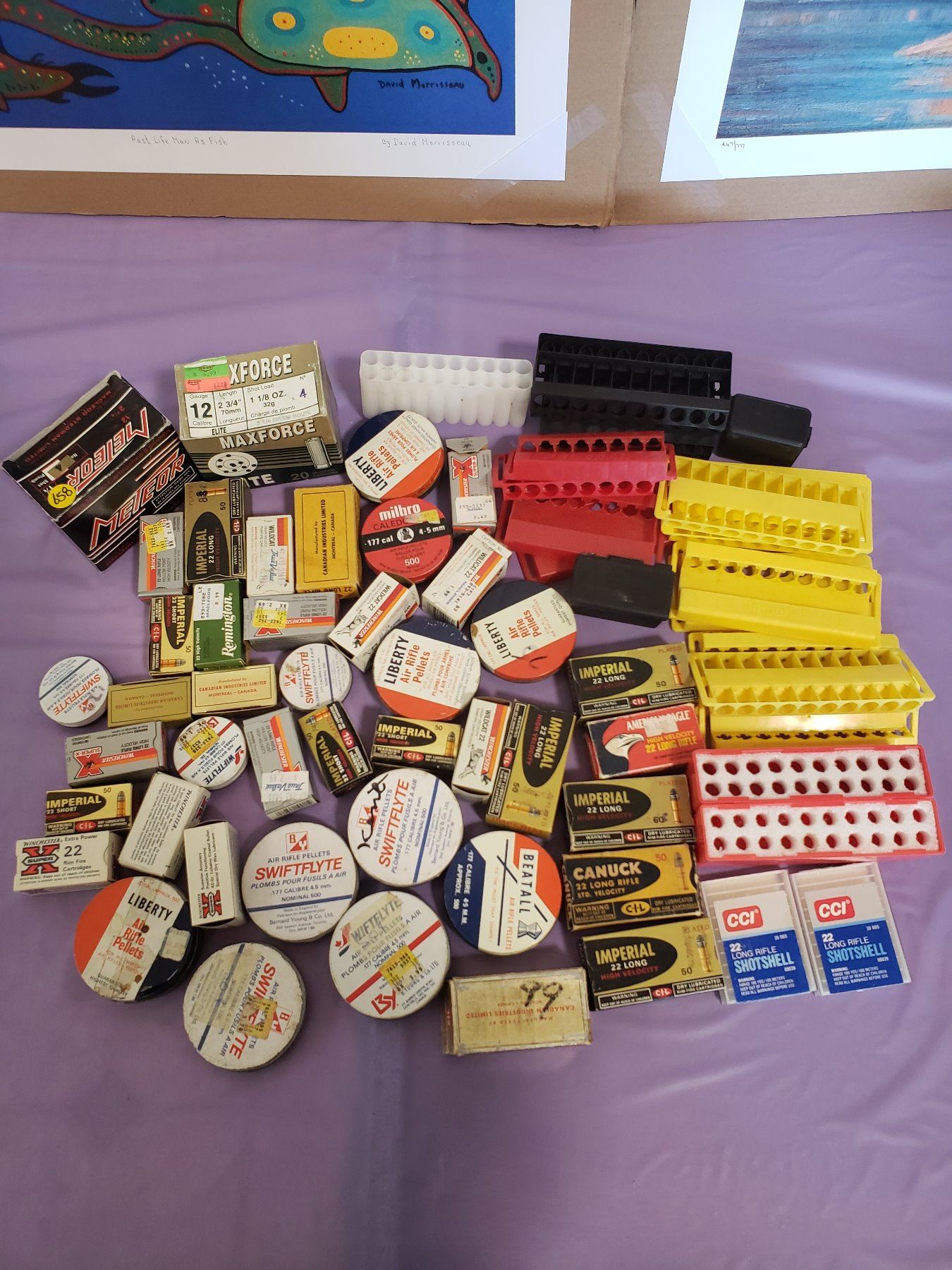 LOT OF EMPTY SHELL BOXES, PLASTIC CATRIDGE HOLDERS & PELLET TINS