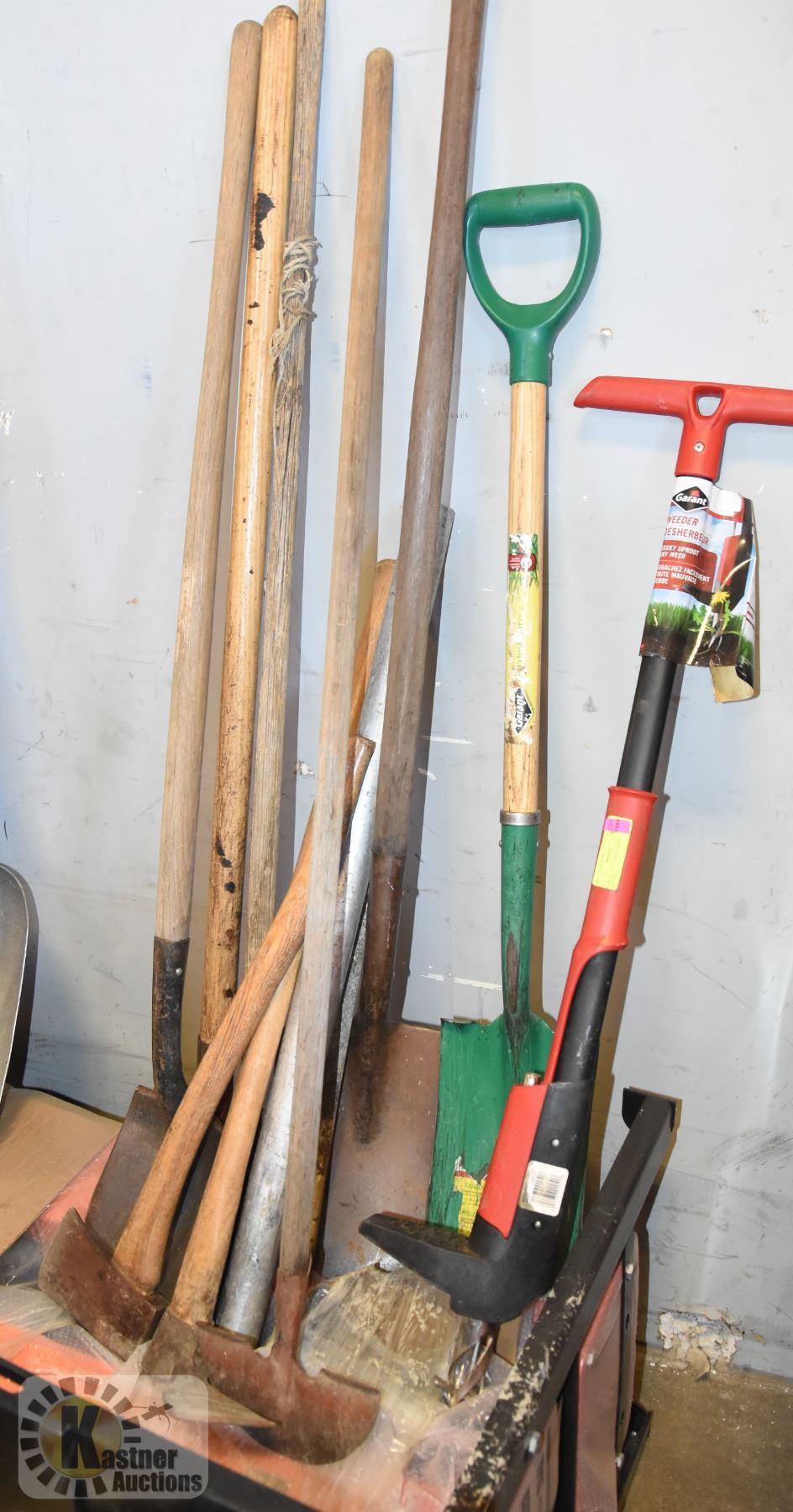 LOT OF ESTATE GARDENING TOOLS, SHOVELS,