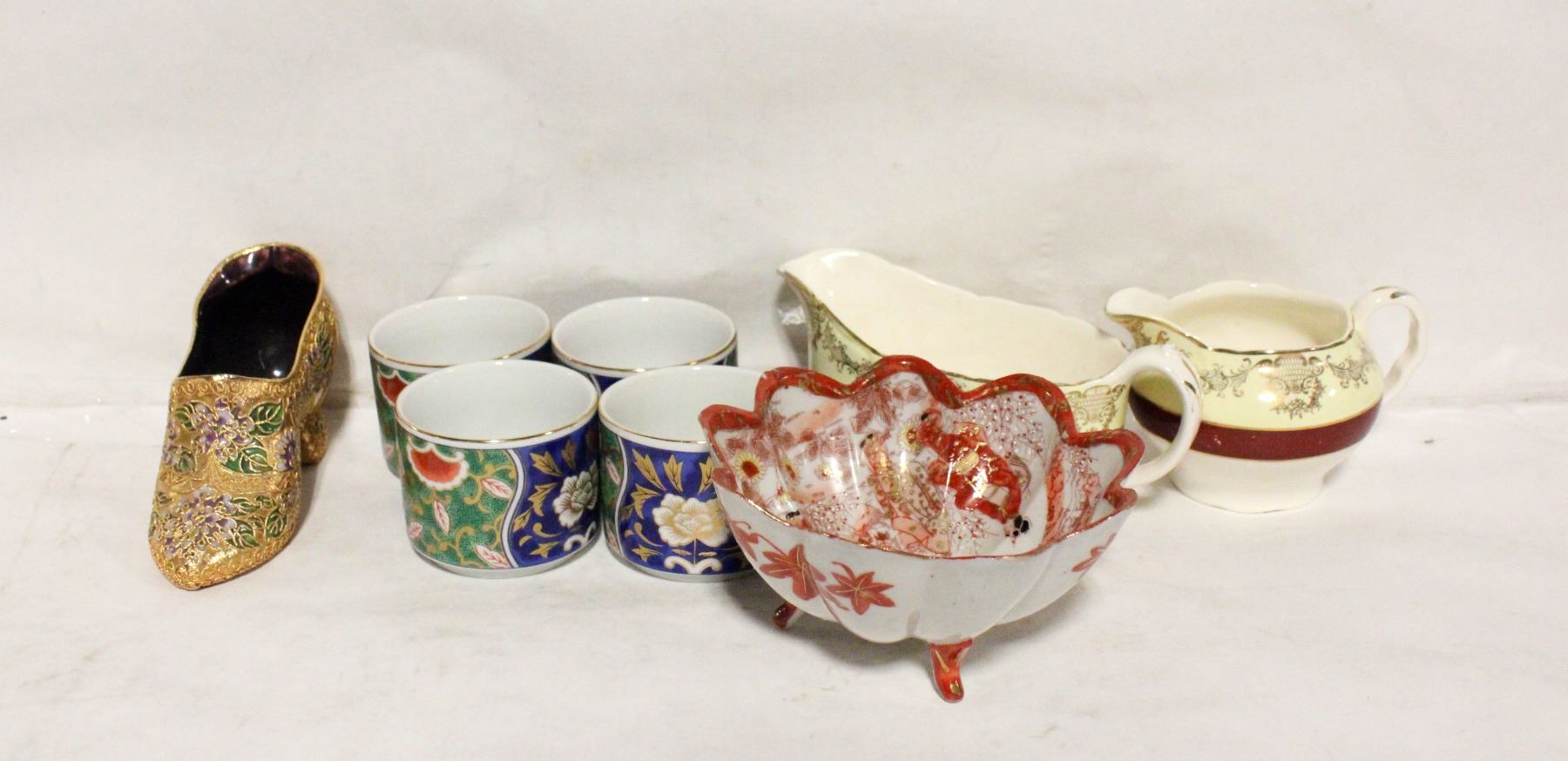 COBALT BLUE GOLD TRIMMED SAKE CUPS, GOLD TONE FILIGREE ENAMELED SHOE, AND MORE