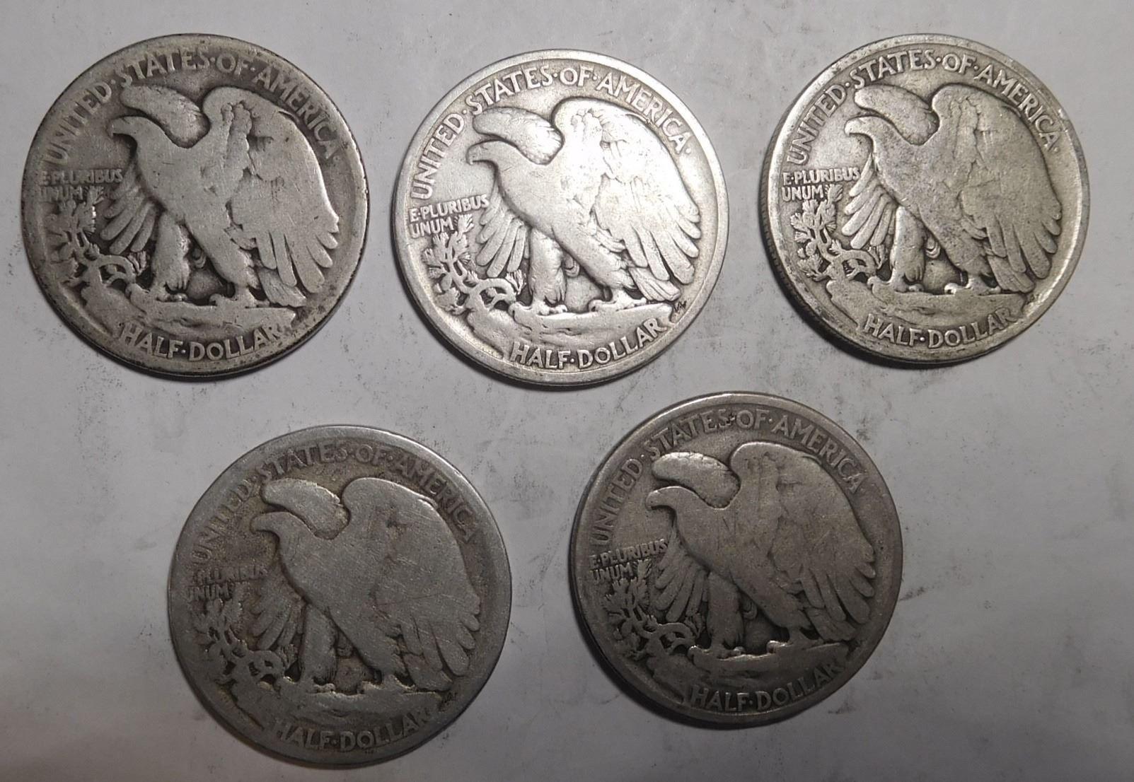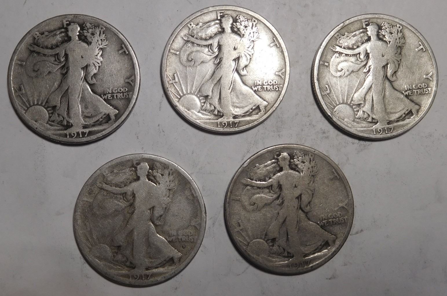 LOT OF FIVE 1917 WALKER HALF DOLLARS G/VG (5 COINS)