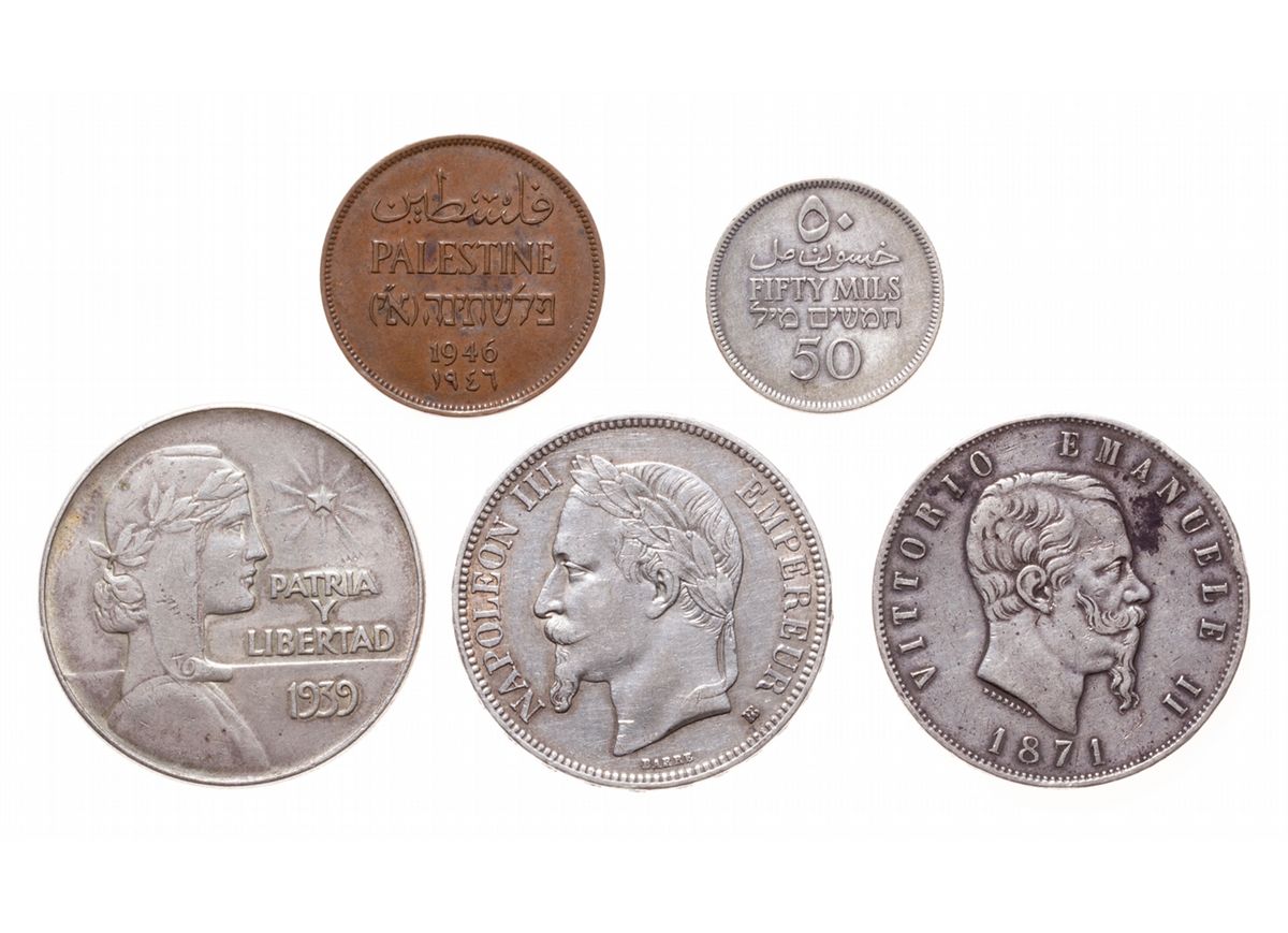 LOT OF FIVE (5) World coins. ITALY. 1871M 5 Lira BN, KM#8.3 VF; FRANCE. 1869BB 5 Francs, KM#799.2 EF; CUBA. 1939 Peso ABC Variety, KM#22 EF; PALESTINE. 1946 2 Mils, KM#2 VF; PALESTINE. 1927 50 Mils, KM#6 VF.