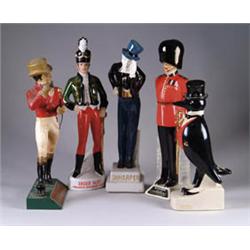 LOT OF FIVE BAR BACK DISPLAYS. Includes ceramic figural displays for Windsor Canadian Whiskey, I.W. Harper, Irish Mist, and Old Crow. Also includes a Johnny Walker composition display on wood base. SIZE: Approximately 15” t. CONDITION: Generally good. PF 9-97007