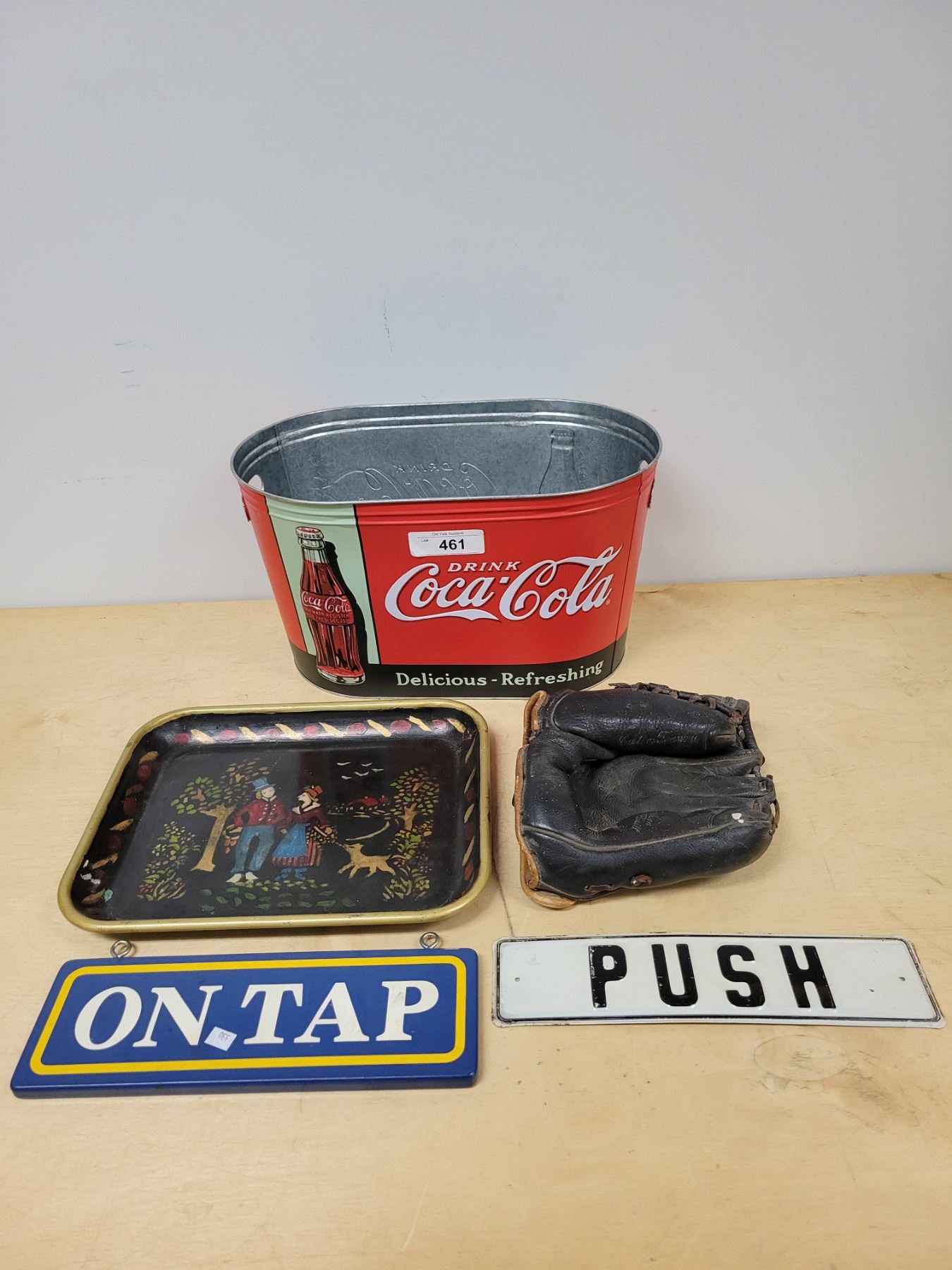 INCLUDING COCA-COLA METAL TUB, ON TAP WOOD SIGN, PUSH METAL SIGN, VINTAGE BASEBALL GLOVE, AND HAND PAINTED SERVING TRAY