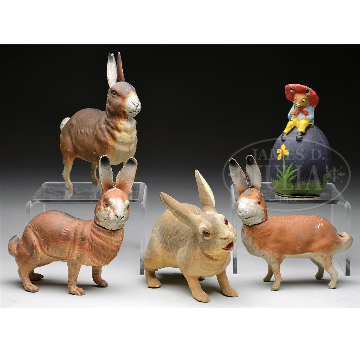 Four out of the five candy containers are German standing rabbits with composition or papier mache materials. Airbrushed with glass eyes. The fifth container is a rabbit sitting atop egg. Composition German manufacture. SIZE: Largest 8" l. CONDITION: One rabbit missing candy closure. Otherwise lot is good to very good. 1-13487