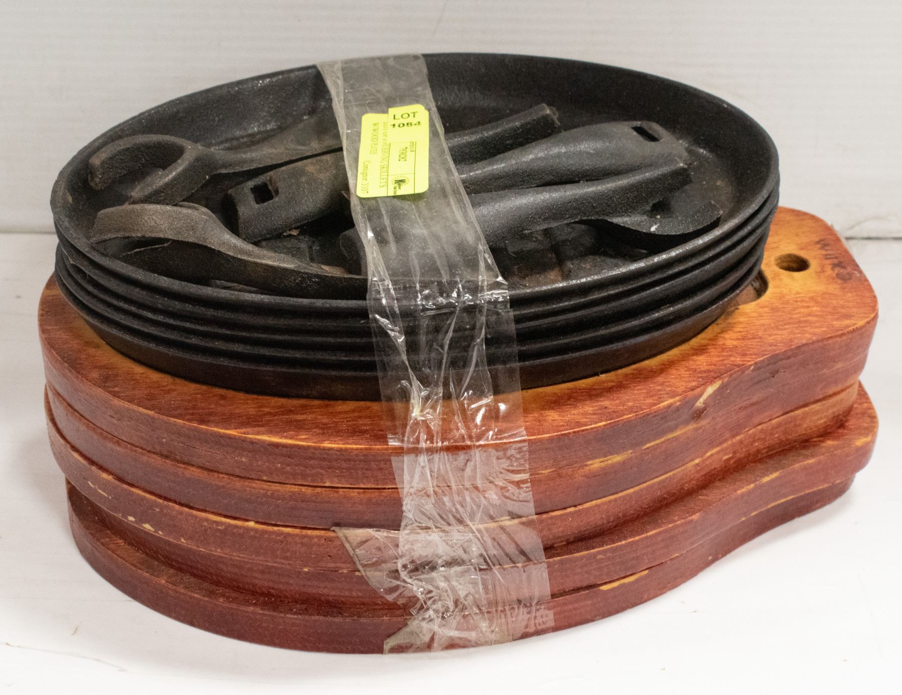 LOT OF FIVE SERVING SKILLETS W/WOOD PLATES