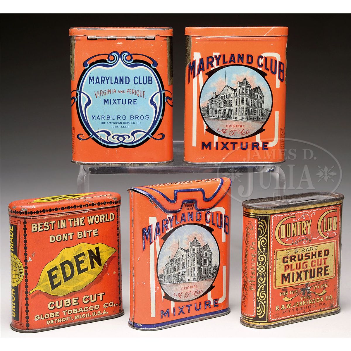 1) Country Club Crushed Plug Cut Mixture; 2) Eden Cube Cut; 3 & 4) Maryland Club Mixture with flat top; 5) Maryland Club Mixture with embossed roll top. SIZE: 1) 3-1/2"; 2) 3-1/2"; 3 & 4) 4-1/8"; 5) 4". CONDITION: 1) Very good; 2) Very good; 3 & 4) Very good to excellent; 5) Near excellent. 1-13226-12