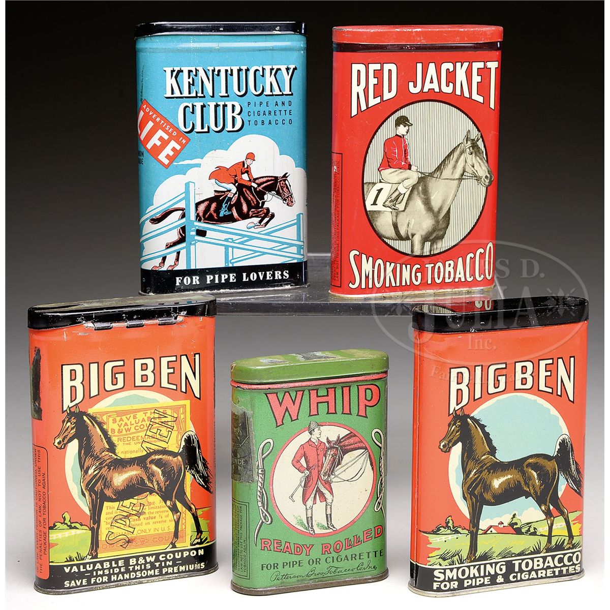 1) Kentucky Club Pipe Tobacco; 2) Red Jacket Smoking Tobacco; 3) Whip Ready Rolled Pipe/Cigarette Tobacco; 4) Big Ben Smoking Tobacco with yellow "Premium" on reverse; 5) Big Ben Smoking Tobacco without "Premium". SIZE: 1) 4-1/2"; 2) 4-3/8"; 3) 3-5/8"; 4) 4-3/8"; 5) 4-3/8". CONDITION: 1) Near excellent; 2) Near excellent; 3) Near excellent; 4) Very good to excellent; 5) Near excellent. 1-13226-16