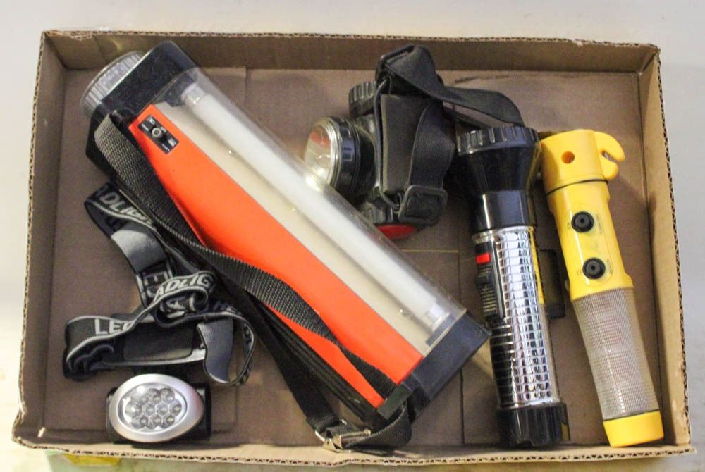 LOT OF FLASHLIGHTS AND HEAD LIGHTS