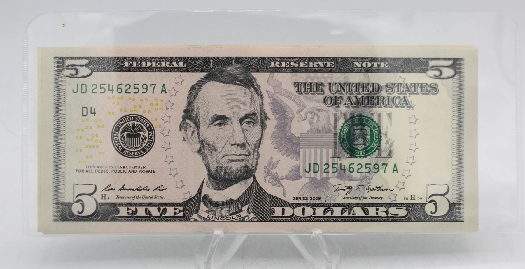 LOT OF FOUR $5 USA FEDERAL RESERVE NOTES.
