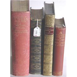 LOT OF FOUR BRITISH BOOKS ON LITERATURE, O'MALLEY, CHARLES, "The Irish Dragoon", published by William Curry, Jr. and Co, Dublin, 1841, 8vo., edited by Harry Lorrequer, 8vo., 2 vols. bound in one, morocco, elaborate embossed, gilded and paneled spines, all edges gilded, illustrated, good condition, wear to edges, joints and corners, sporadic minor foxing and moisture marks, inscriptions by previous owners, COOKS, E. T. (ED.), "The Works of Ruskin - Library Edition - Vol. 26 'Deucalion and other Studies in Rocks and Stones'", published by George Allen, London, 1906, gilded cloth binding, top edge gilded, limited edition of 2062, illustrated, good condition, cover faded and worn, clean copy, loss to exterior page, HAZLIT, WILLIAM, "Lectures on the Literature of the age of Elizabeth and Characters of Shakespear's Plays", published by Bell, Daldy, London, 1870, small 8vo., gilt detailed cloth binding, good condition, foxing on outer edges only, covers good condition, slight wear, DISRAELI, I., "Miscellanies of Literature", published by Edward Moxon, London, 1840, first edition, 4to., full calf binding, elaborate embossed, gilded and paneled spine, steel engraved title page, marbled edges and endpaper, good condition, clean interior, outer pages with sporadic foxing