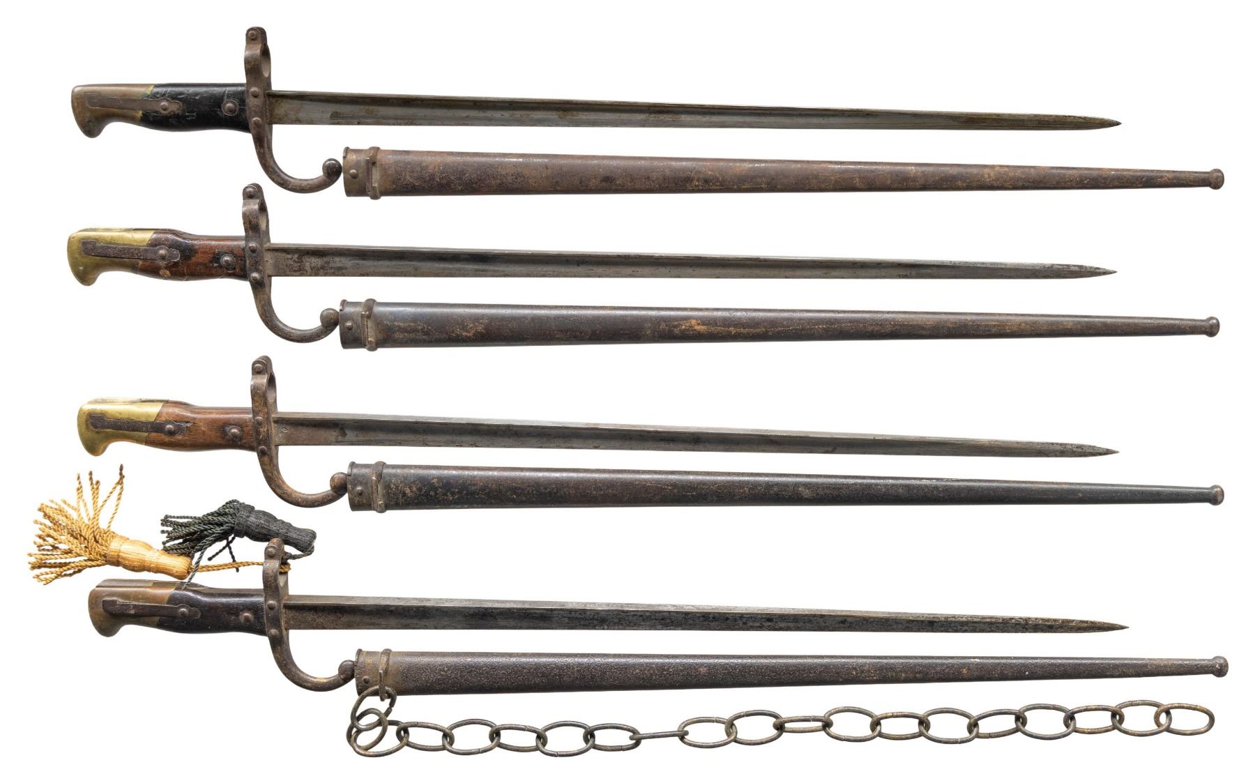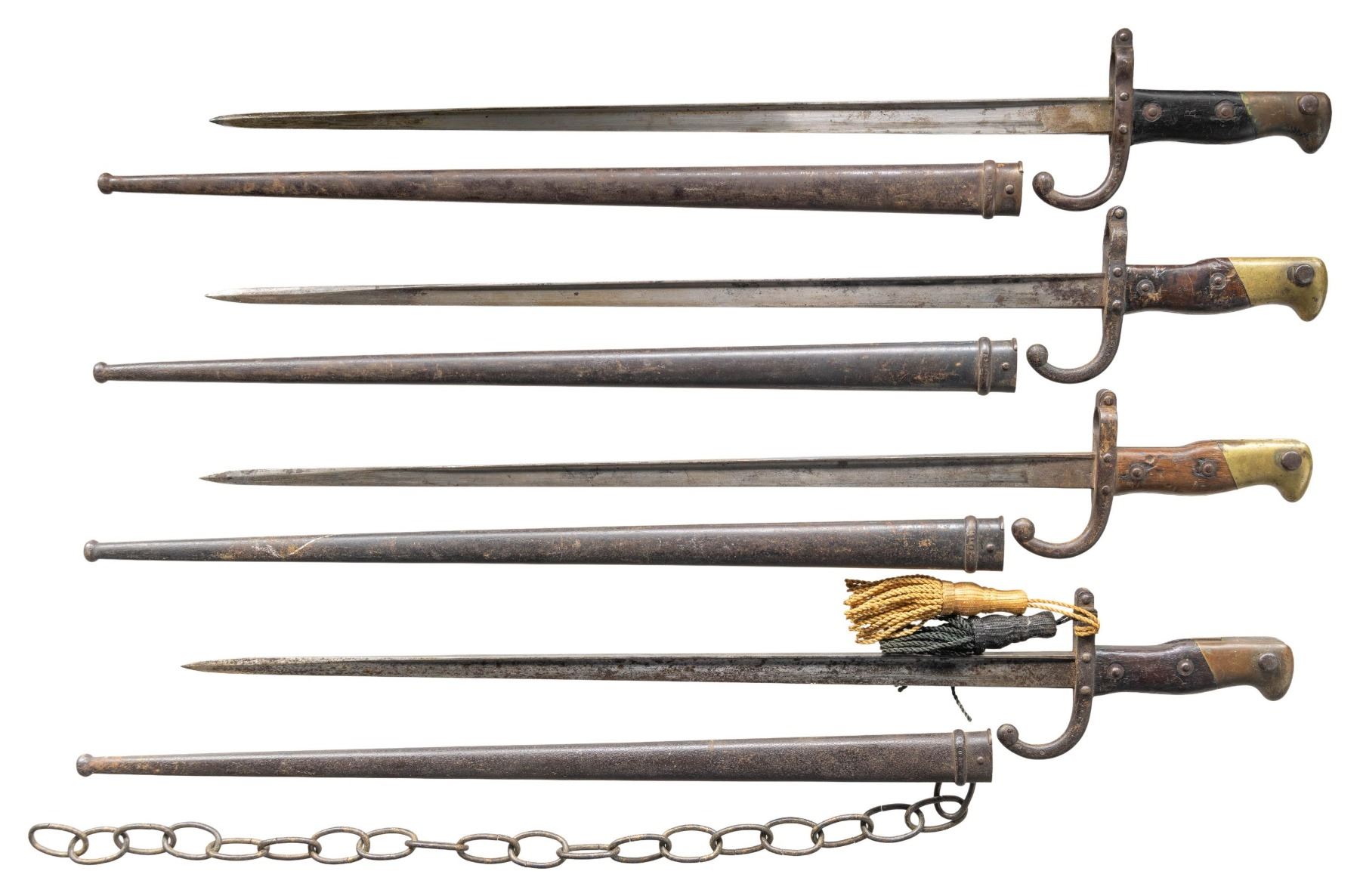 This lot consists of four French 1874 Gras bayonets. Bayonets have mismatch numbered scabbards & two have portapees. One bayonet has colonial anchor marking. CONDITION: metal parts of bayonets & scabbards show oxidation, pitting, dings, fading & other wear. Grip panels show darkening, dings, cracks, chips & handling marks. Some grip panels show added initials. (02-25315/MJC). NON-GUN. $200-300.