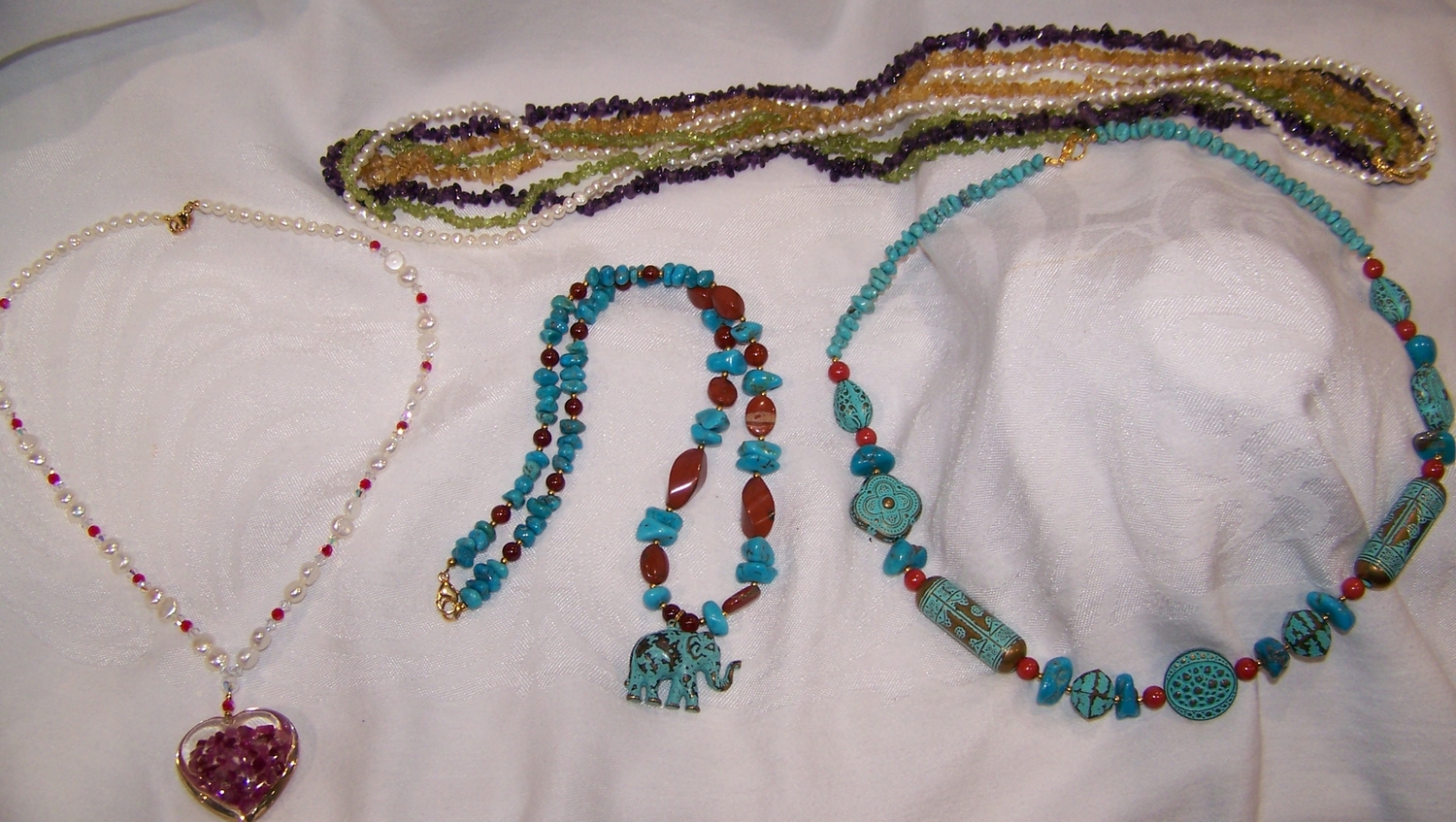 (1) SINGLE STRAND NECKLACE OF TURQUOISE 7 JASPER BEADS, A TURQUOISE PAINTED BRASS ELEPHANT PENDANT & GOLD PLATED CLASP.