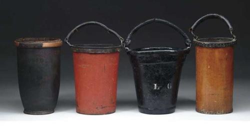 LOT OF FOUR PAINTED LEATHER FIRE BUCKETS. Three with handles, one with detached handle. Colors are red and black. One with over paint with original decoration underneath which can be seen of a banner and burning house. SIZE: Range from 11-1/2" to 13-1/2" to tops of rims. CONDITION: Fair to good. 9-27879