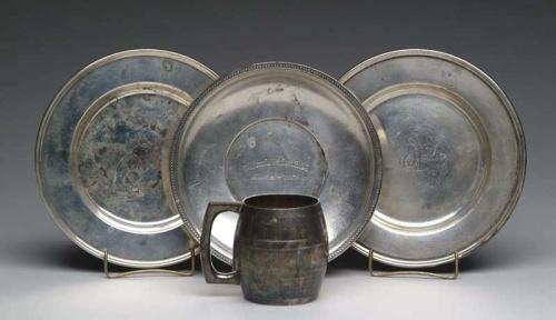 LOT OF FOUR PIECES OF SILVER. Lot includes a very early sterling silver plate by Tiffany & Co. with “1703 5577”. The mark dates between 1865 and 1870 and has “M” with “Quality 925-1000” in a block. The saucer like plate is engraved “William B. Vanderbilt Jr. Dec. 21st 1870”. William was the son of William and Consuelo Vanderbilt. William Jr. was an avid race car driver. SIZE: 7” dia. A pair of sterling 7” plates by Dominick & Haff. These plates have a double monogram script center and are inscribed on the bottom “From Ellen F. Fitz Simons & Paul Fits Simons 24th of Feb. 1931”. The fourth item is a Continental 3” handled mug hallmarked with three castles and an “AS”. WEIGHT: 30 tr. oz. CONDITION: Generally very good. 9-26241