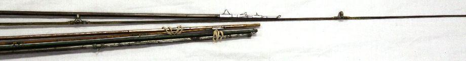 Lot of four vintage fishing rods. One 3 piece with wood handle and steel rod, one with cork handle and steel rod, 1 piece, manufactured by Standard, a telescoping rod manufactured by Bristol, and a cork handled split bamboo two piece rod by Sunnybrook. Rods measure from 36 to 108 inches long. Show typical age and wear.