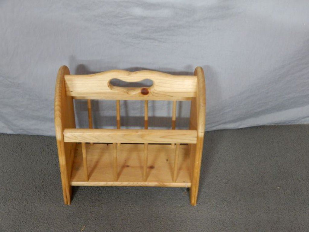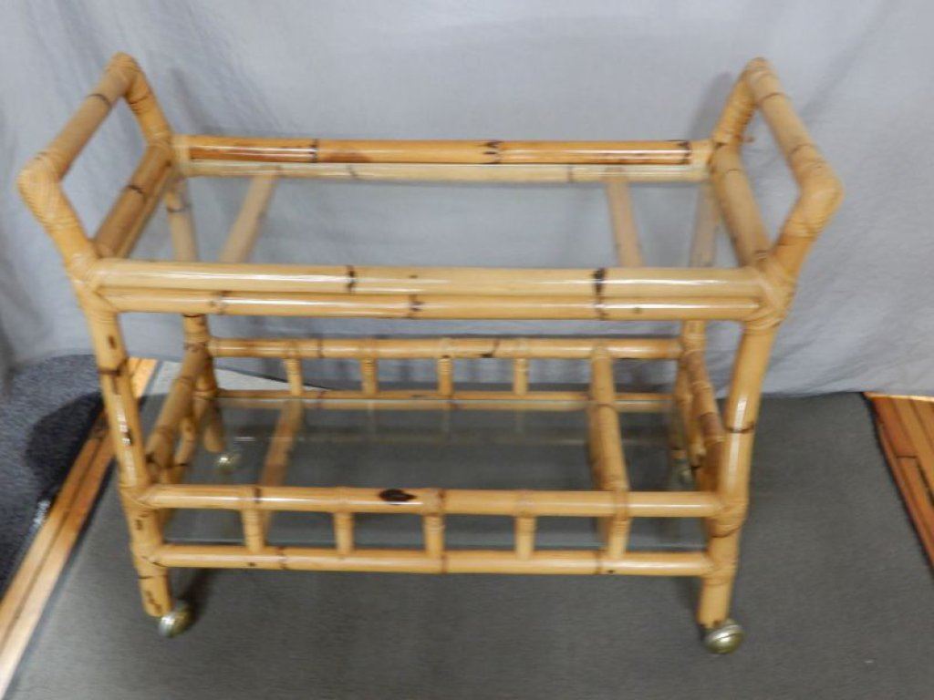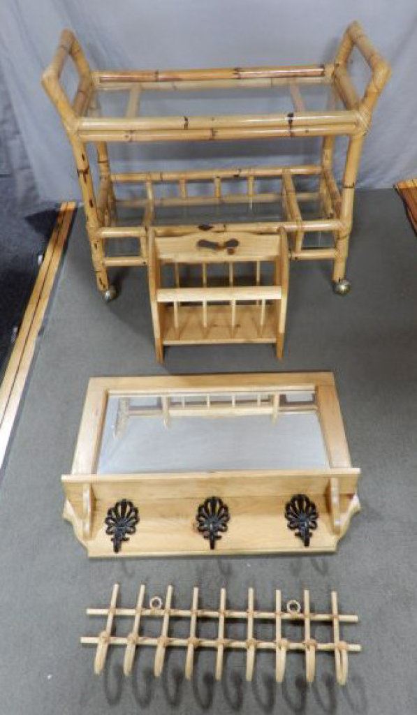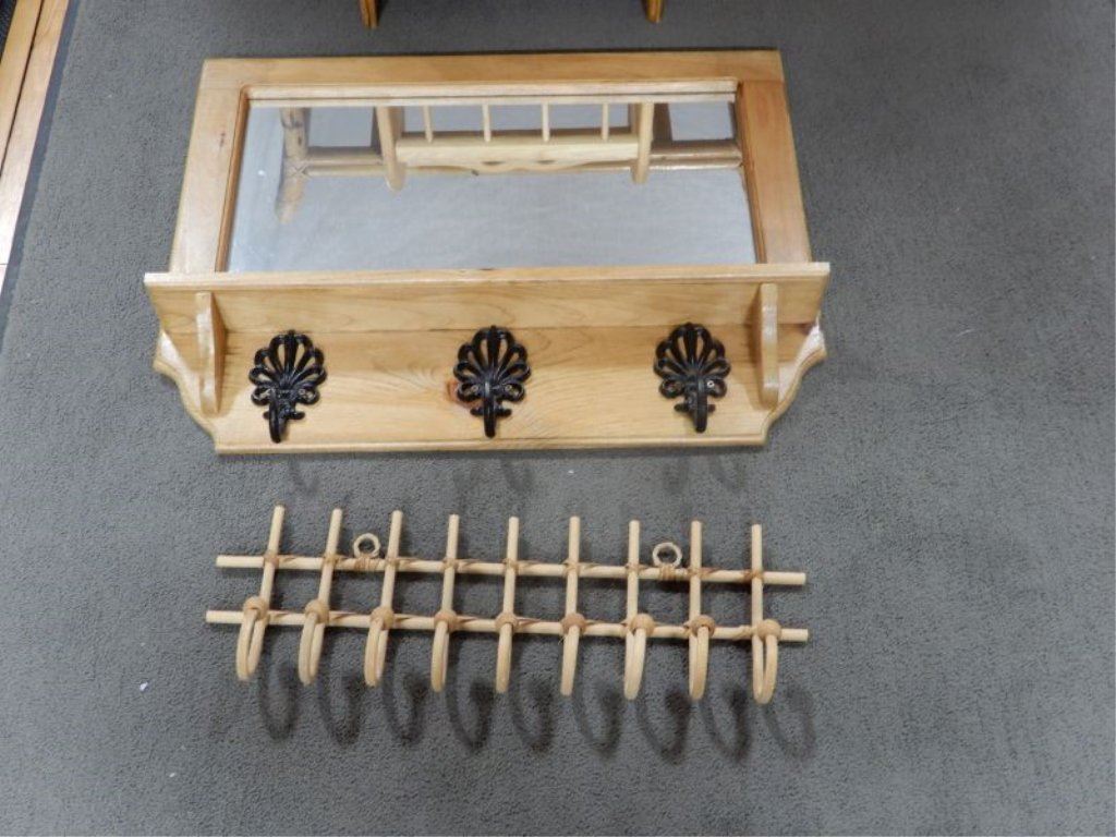 LOT OF FURNISHINGS 2 COAT HANGERS - MAGAZINE RACK - WOODEN TABLE WITH GLASS SHELVING ON CASTERS LOCATION: UPPER LEFT