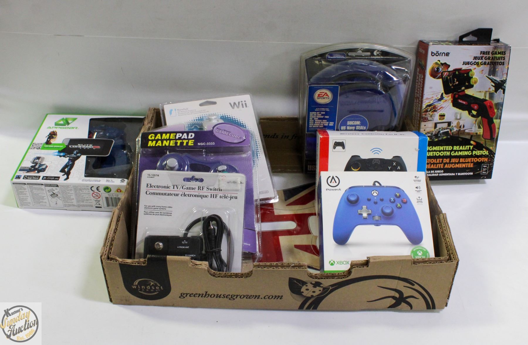 XBOX ENCHANCED WIRED CONTROLLER (MISSING COED), WIRELESS CONTROLLER FOR N-SL, SEALED NUNCHUK WII REMOTE, SEALED GAMEPAD MANETTE, SEALED GEL SKIN'S GUITAR & MORE **ALL ITEMS MUST BE REMOVED BY 5PM SATURDAY, NOVEMBER 15TH 2025. ALL REMAINING ITEMS WILL BE SUBJECT TO A $6.00 PER DAY STORAGE CHARGE. ANY ITEMS REMAINING AFTER MONDAY, DECEMBER 1ST 2025 WILL BE CONSIDERED FORFEITED. NO REFUNDS WILL BE ISSUED FOR FORFEITED ITEMS. TO SCHEDULE A PICK UP APPOINTMENT CLICK HERE