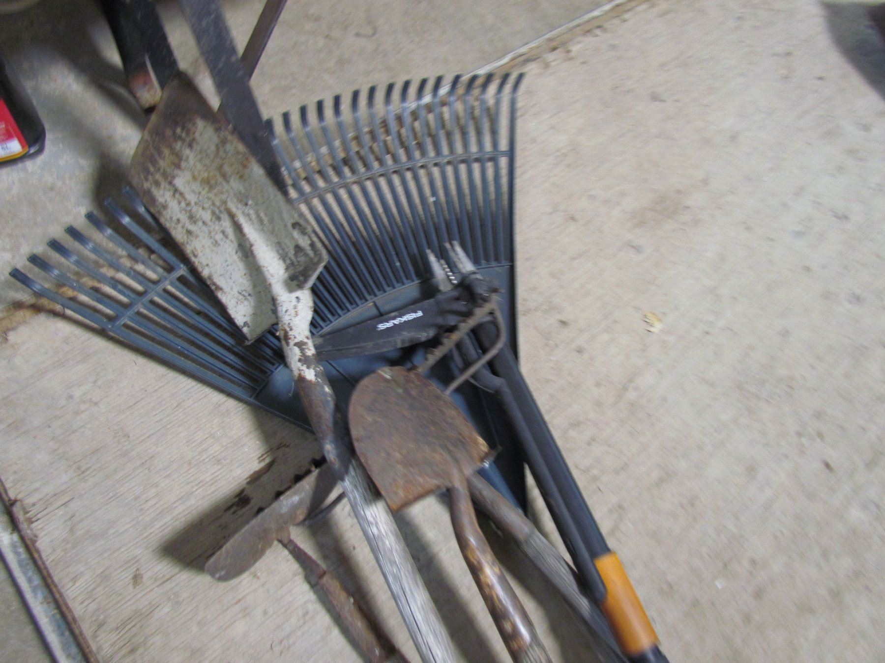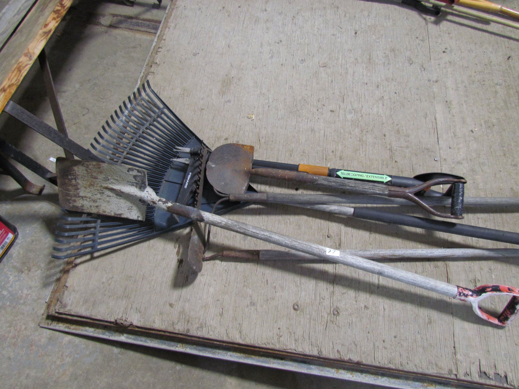 LOT OF GARDEN TOOLS (SHOVELS, HOES, RAKES)