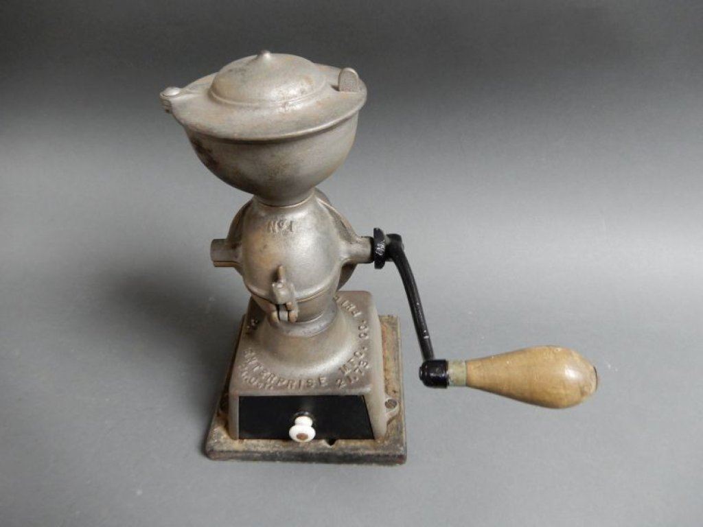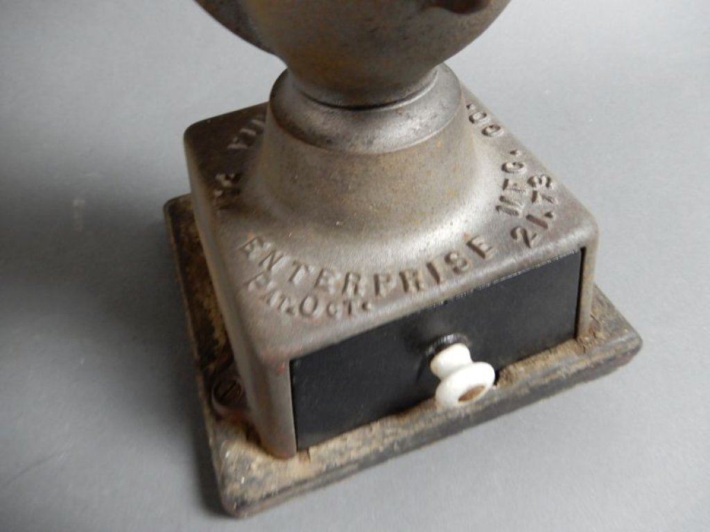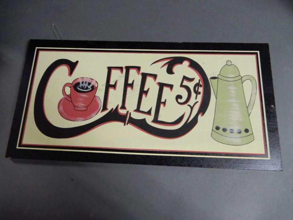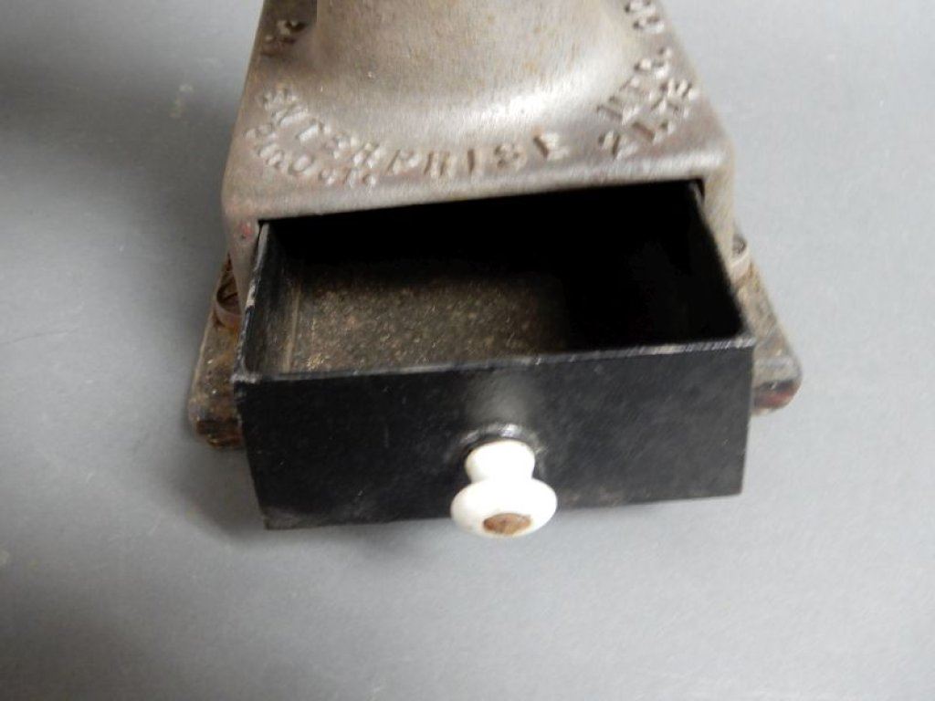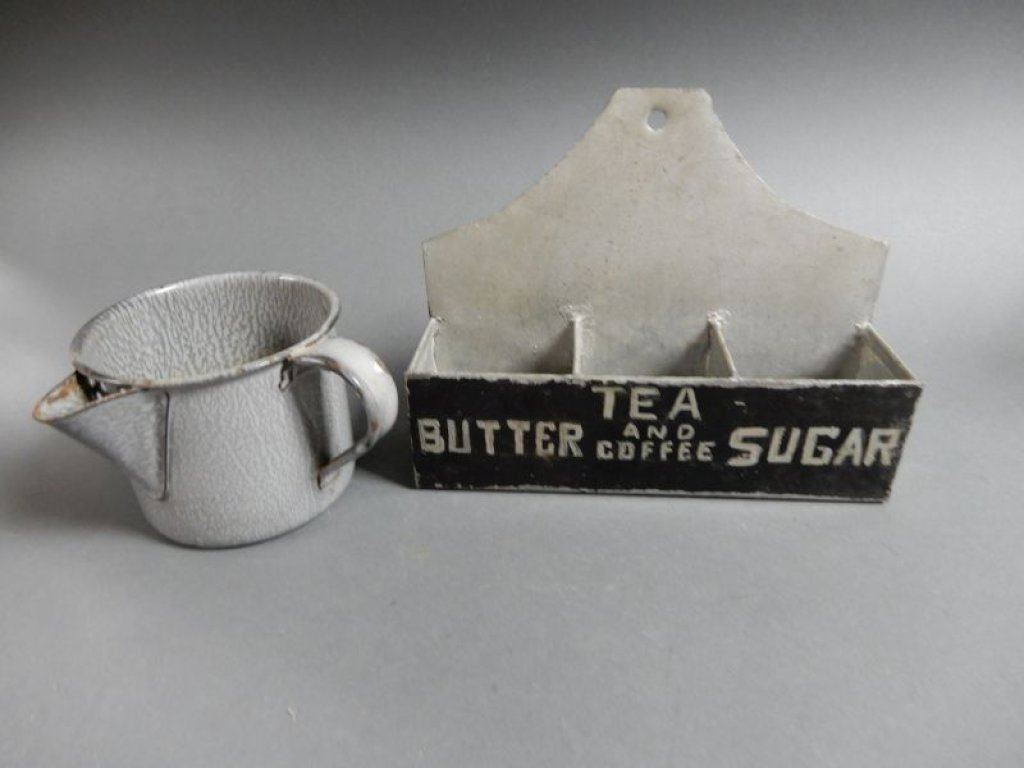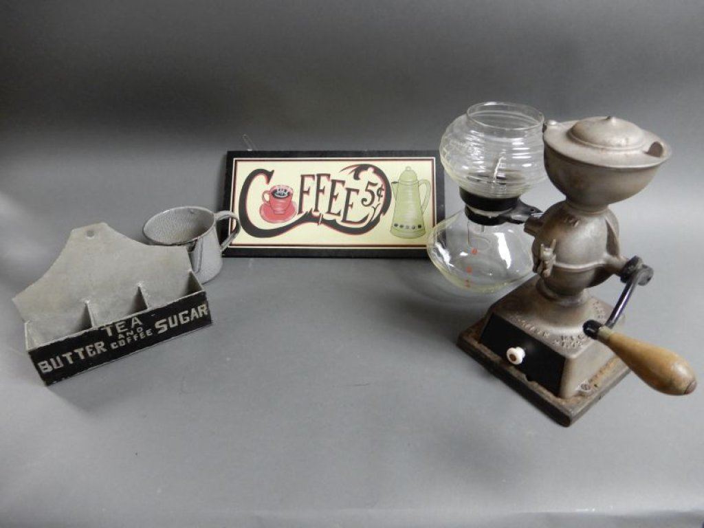 LOT OF GENERAL STORE ENTERPRISE COFFEE MILL, COFFEE POT, COFFEE 5 CENT SIGN, TIN MUG, CONFECTIONARY SEPERATOR LOCATION: LOWER LEFT