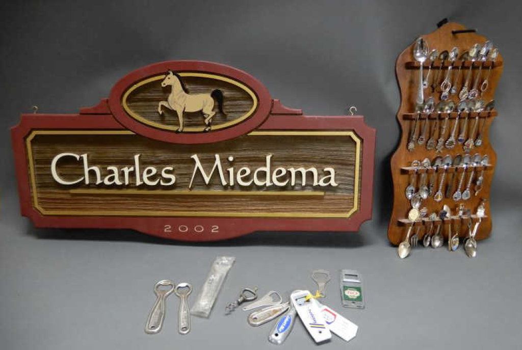 CHARLES MIEDEMA 2002 WOODEN SIGN SPOON RACK WITH SPOONS BOTTLE OPENERS