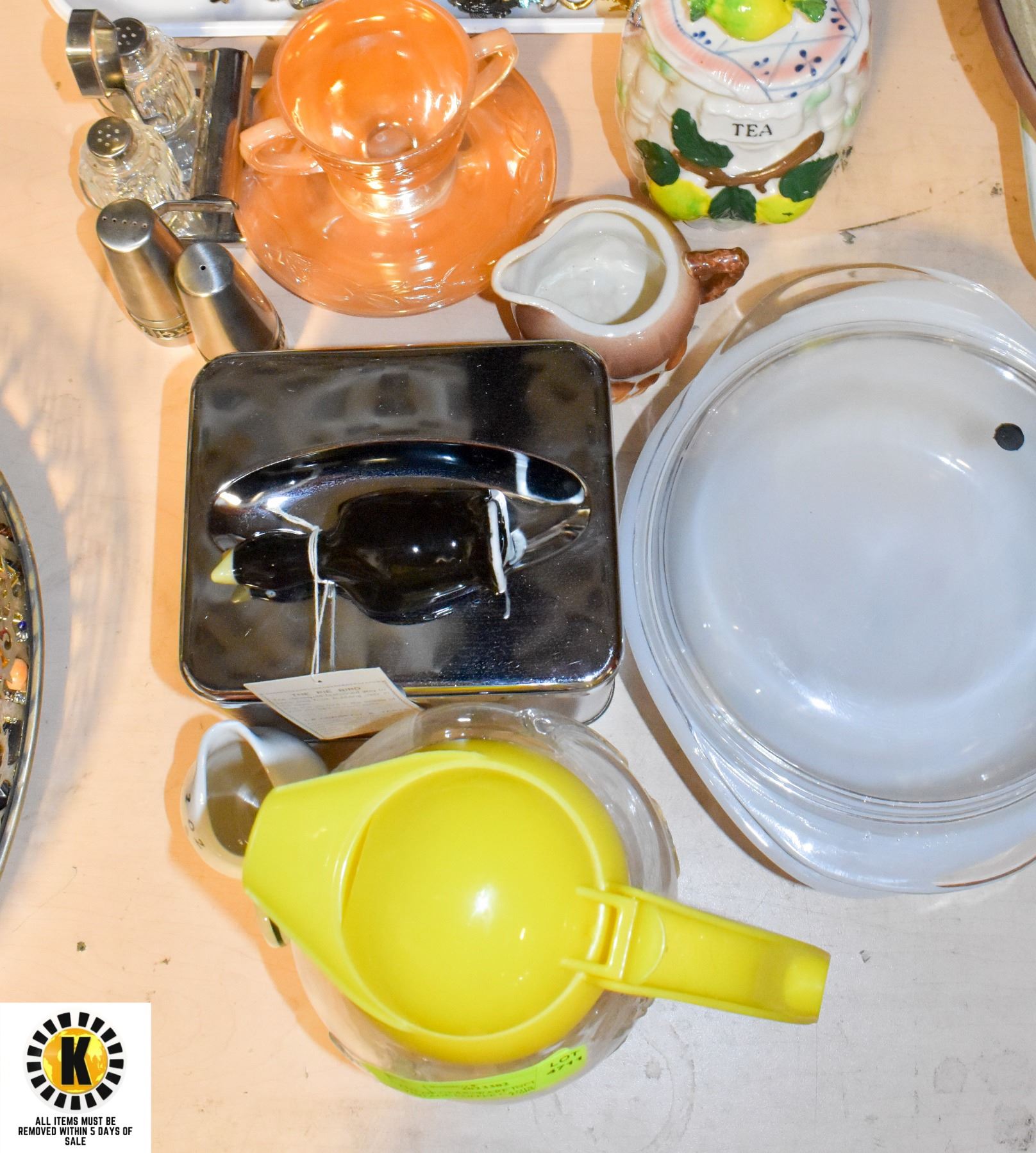 MUSHROOM CREAMER, BLACK PIR BIRD, FRUIT TEA CANNISTER, FIRE KING SUGAR AND SAUCER AND MORE.
