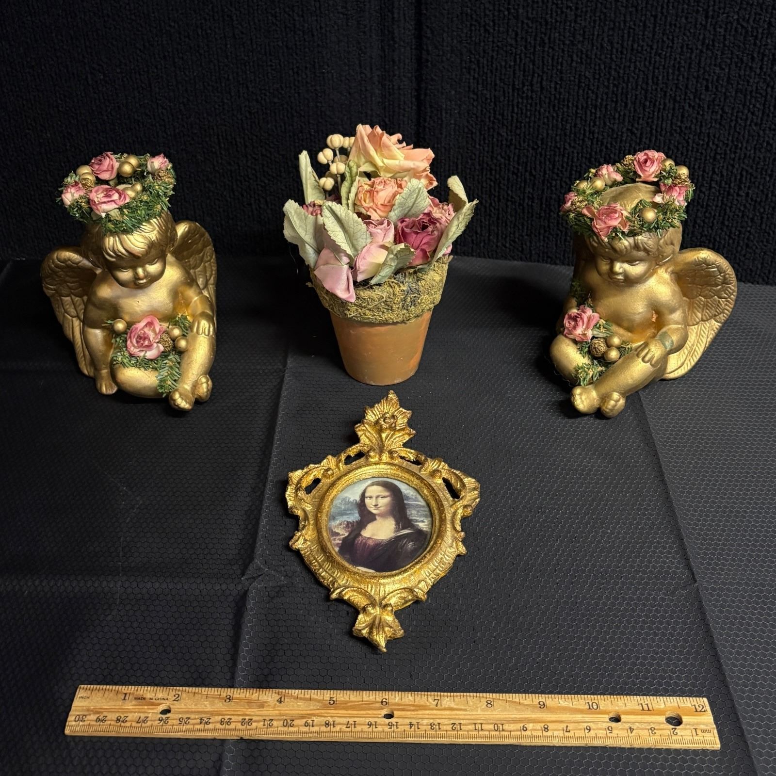 Clay pot contains silk flowers, flowers on cherubs also - 7 in.