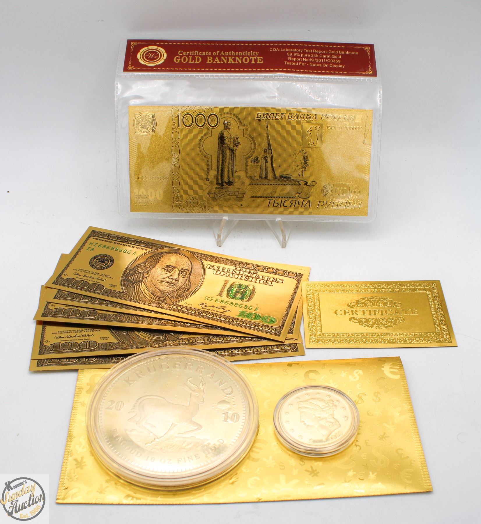 INCLUDES REPLICA 10OZ KRUGERRAND FYNGOUD FINE "GOLD" BAR, US $20 "GOLD" COIN, 5X $100 24K GOLD FOIL BILLS AND 1000 RUBLE GOLD FOIL BILL, NONE OF THESE PIECES ARE LEGAL TENDER. **ALL ITEMS MUST BE REMOVED BY 5PM SATURDAY, NOVEMBER 29TH 2025. ALL REMAINING ITEMS WILL BE SUBJECT TO A $6.00 PER DAY STORAGE CHARGE. ANY ITEMS REMAINING AFTER MONDAY, DECEMBER 15TH 2025 WILL BE CONSIDERED FORFEITED. NO REFUNDS WILL BE ISSUED FOR FORFEITED ITEMS. TO SCHEDULE A PICK UP APPOINTMENT CLICK HERE