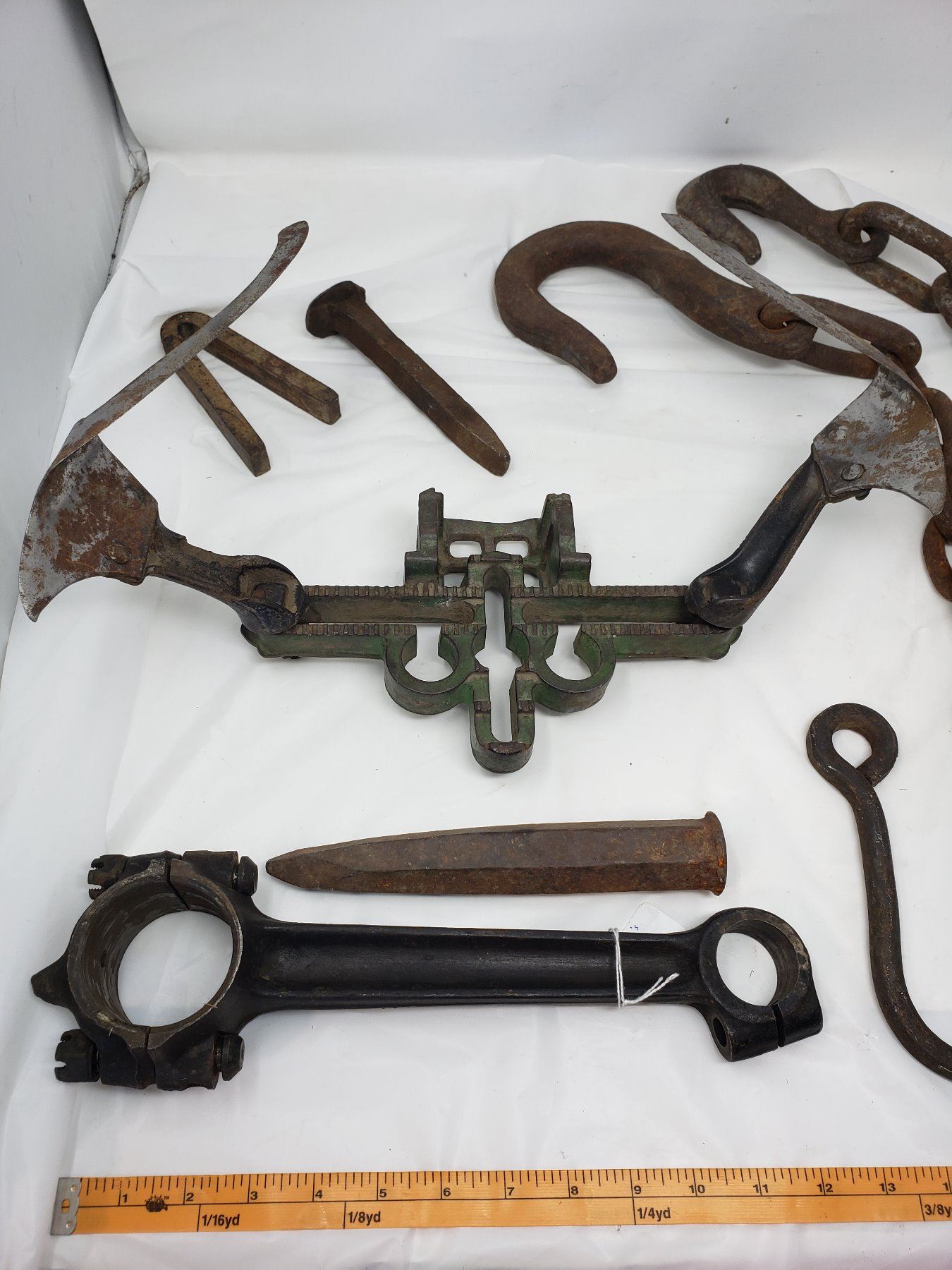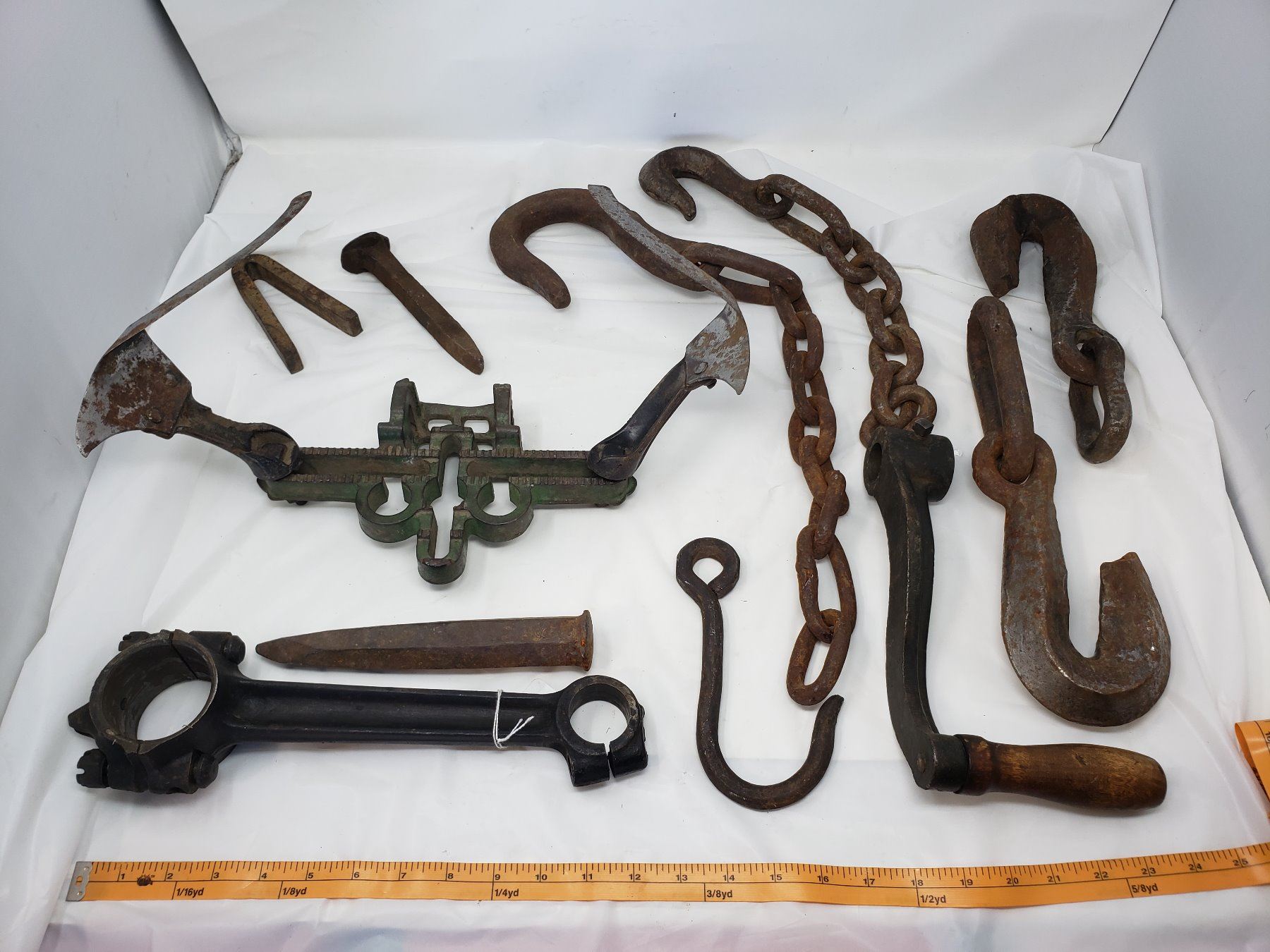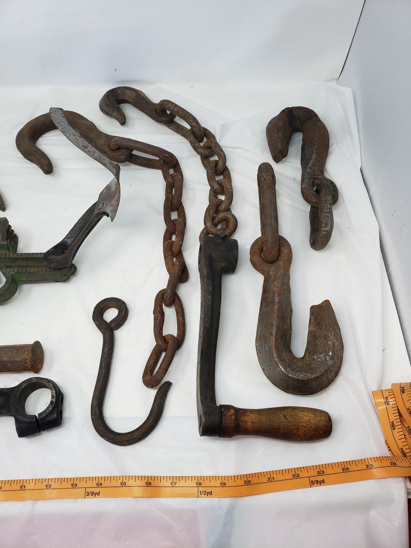 LOT OF HAND FORGED HOOKS, MISC FARM PIECES