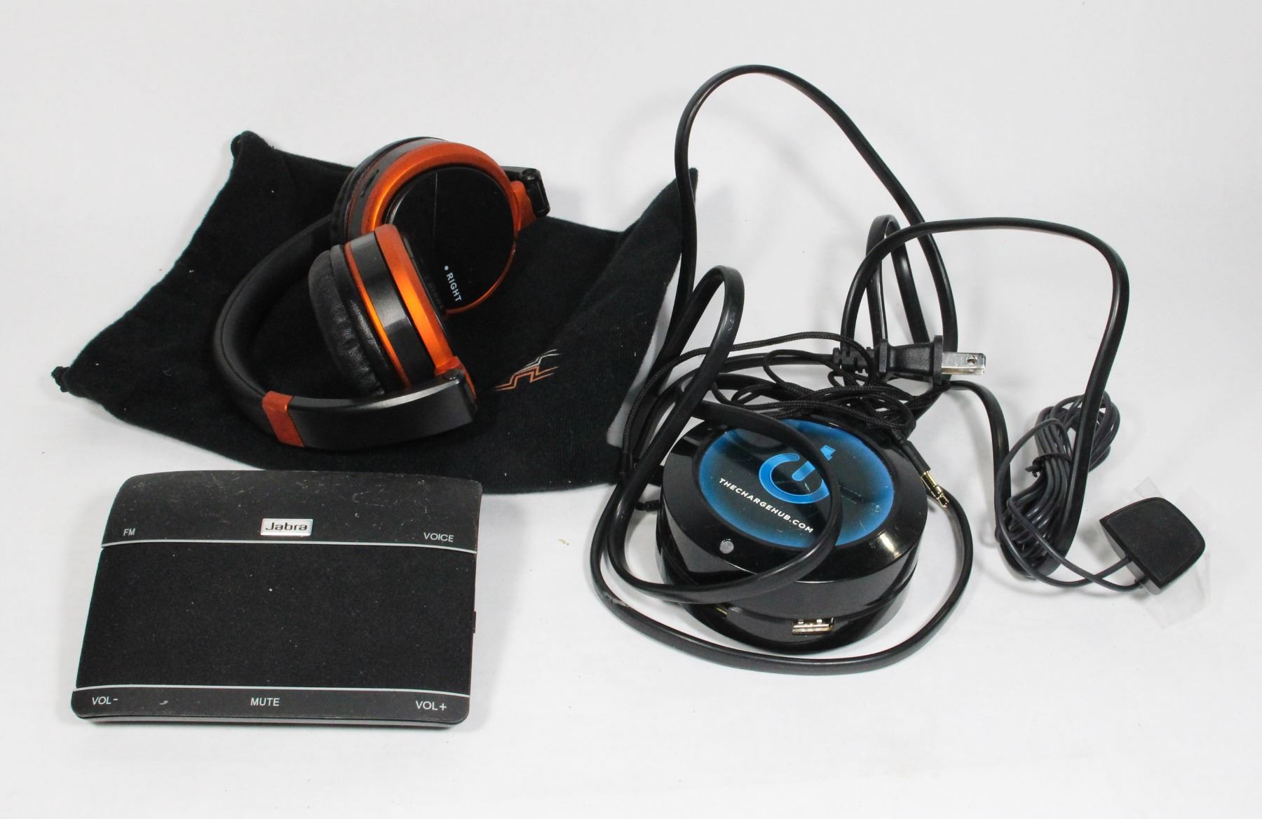 BLACKWEB HEADPHONES, JABRA FREEWAY MODEL HFS100 BLUETOOTH HANDS FREE CALLING, AND CHARGE HUB