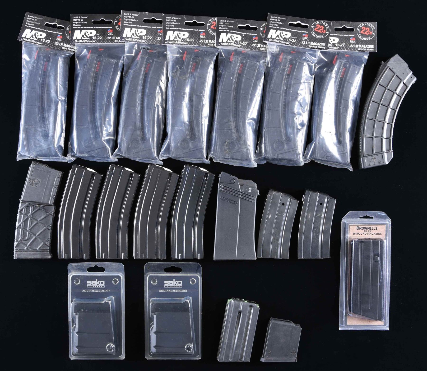 All are new or near excellent. 7 S&W M&P 15-22, 25 rd. / 2 Sako labeled for Beretta TRG-22 in 308 Win., 10 rd. / 1 MSAR XM30-E4 of AR style, 30 rd. / 1 Saiga 12 Ga. 5 rd. / 1 Polymer AR, 5 rd. / 1 unbranded US made for AK, 30 rd. / 2 factory Ruger Mini-14, 20 rd. / AR MAGS: Brownell, 25 rd. / 1 unmarked steel 20 rd. with green follower. / 4 unmarked gloss black steel 30 rd. with white followers and AK style push button floor plates. (02-23888/NW). $450-600.