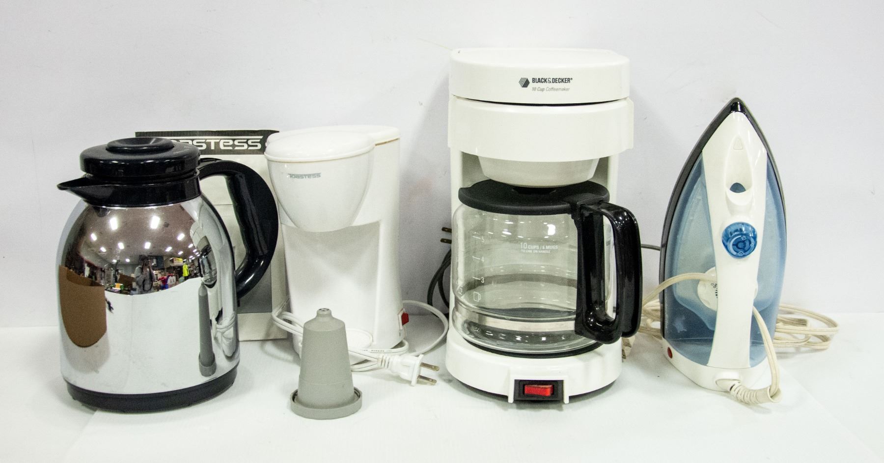 PROCTOR SILEX IRON, BLACK & DECKER 10 CUP COFFEE MAKER, V-TECH CORDLESS PHONE WITH BASE PHONE (LARGE BUTTONS), TOASTESS 1 CUP COFFEE MAKER AND 10 CUP KEEP WARM COFFEE CARAFE