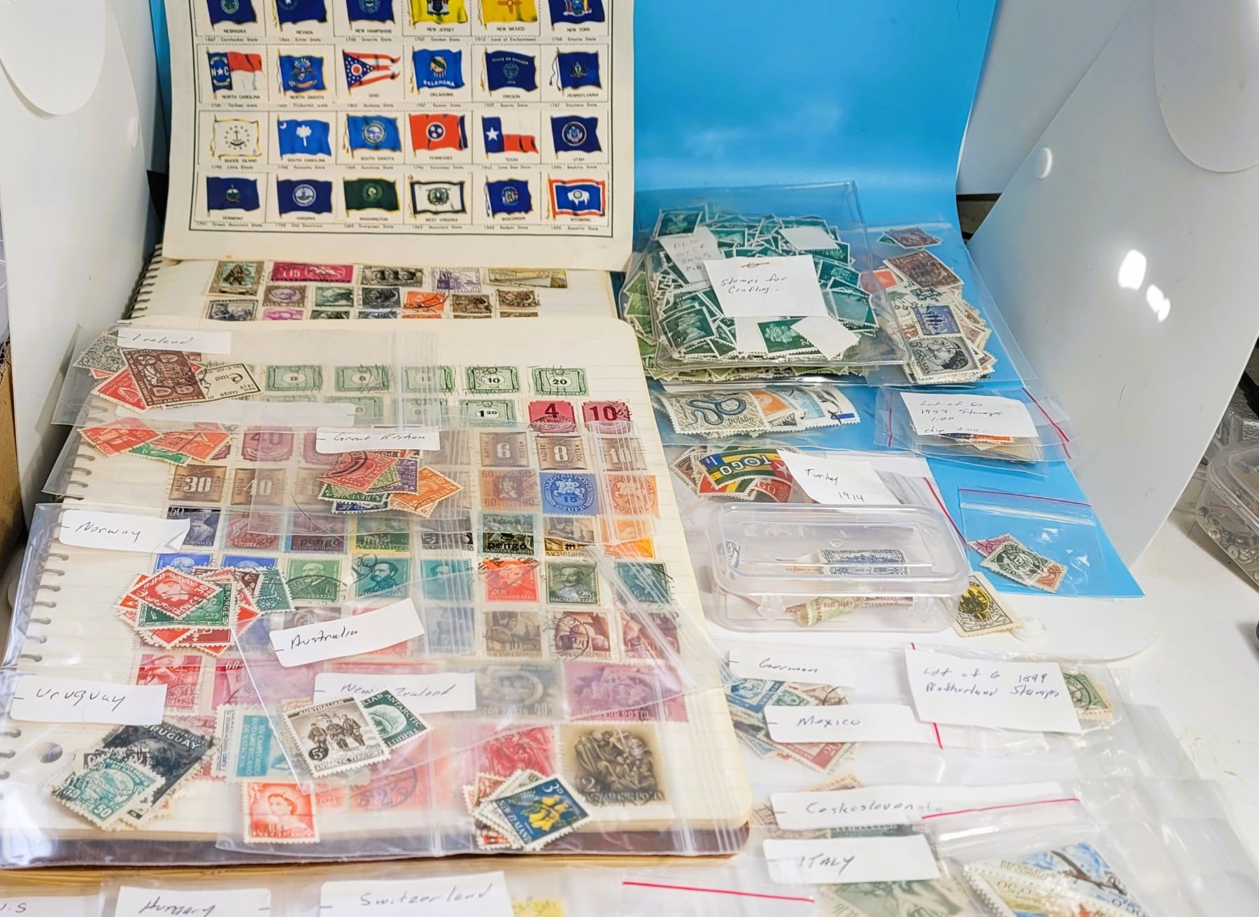 POSTAGE STAMPS, 2 NOTEBOOKS FILLED WITH STAMPS AND MORE. COLLECTIBLES