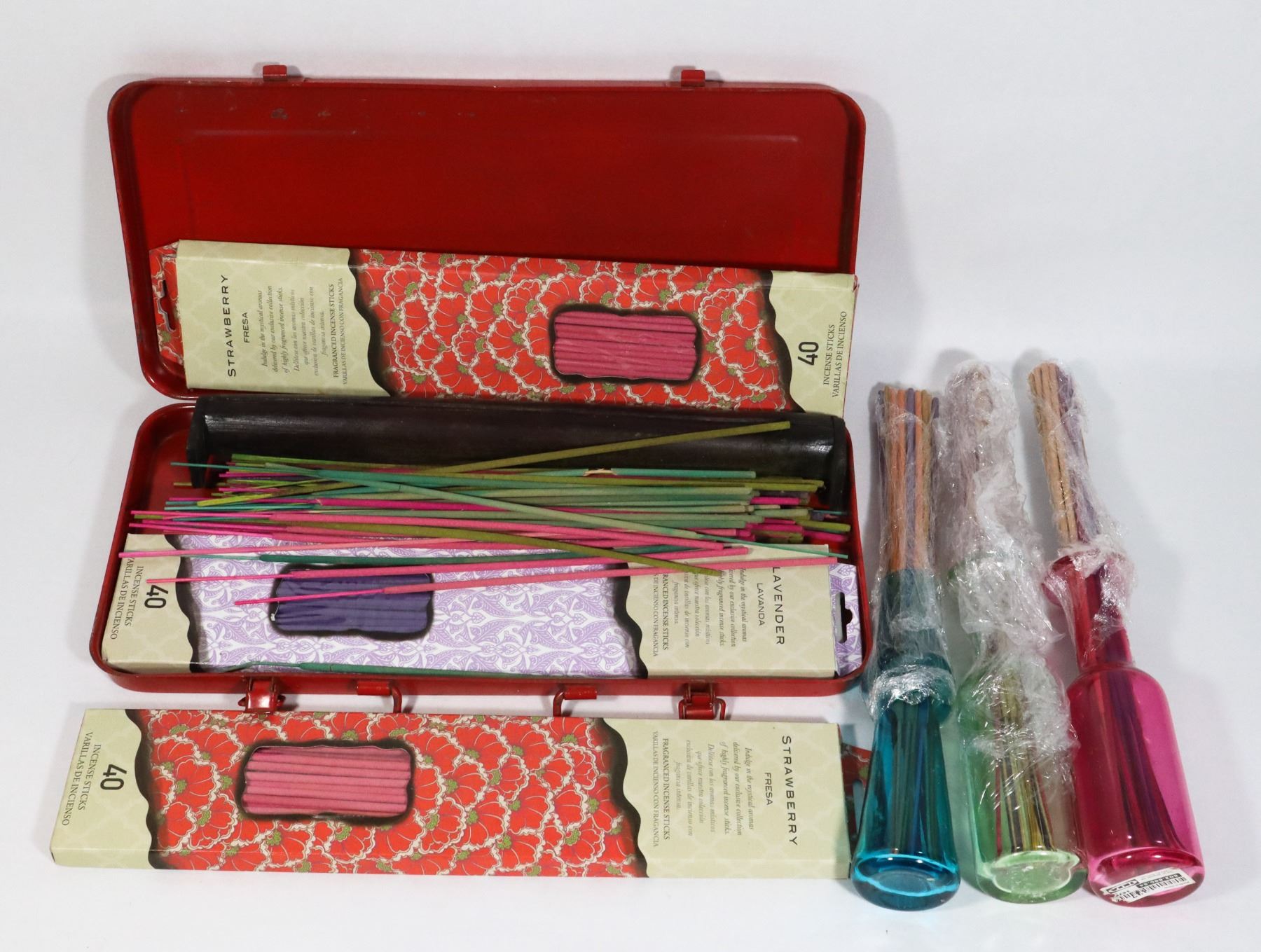 LOT OF INCENSE STICKS AND STORAGE BOTTLES
