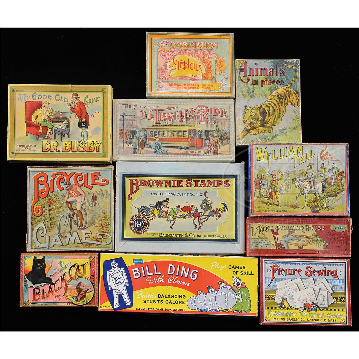 1) "The Good Old Game of Dr. Busby" by Parker Bros., Salem, MA circa 1900. 2) The game of "Bill Ding" by Strombecker, USA 1930s/1940s. Boxed wooden clowns. 3) "The Game of the Trolley Ride" by Hamilton-Meyers, Middleton, PA. Beautiful chromolithographed box cover. 4) "William Tell" by Singer, N.Y. boxed ring toss game. 5) "The Junior Printing House" 1868 rubber alphabet stamp set. 6) "Combination Stencils" by Milton Bradley, Springfield, MA 1903. 7) "Picture Sewing" Embroidery for Little Hands by Milton Bradley. Designed perforated cards with thread and needles circa 1890. 8) "Animals In Pieces" by Edgar Clark, N.Y. chromolithographed puzzle. 9) "Brownie Stamps" and coloring outfit by Baumgarten & Co., Baltimore. Ten rubber Brownie stamps with crayons and book. 10) "The Game of Black Cat" by McLoughlin Bros., 1886. Vivid coloring on box top. 11) "Bicycle Game" (no maker). Interior and box cover shows beautiful lithography bicycle race. Paper and wooden game pieces. SIZE: Largest 11" l. PROVENANCE: The Diane and late Steve Olin collection. CONDITION: Good to excellent. 13271-35