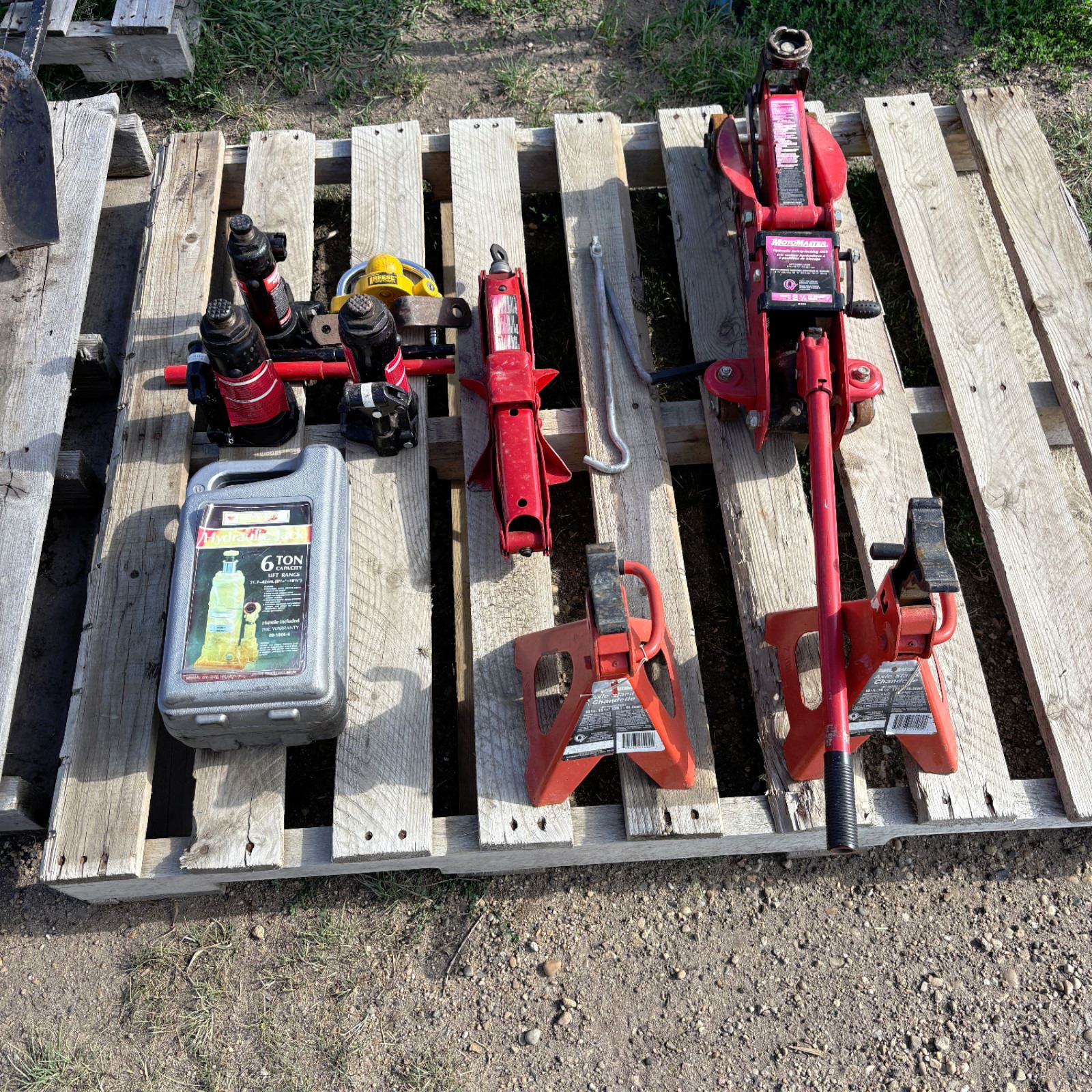 Pallet w/ 6 ton jack, three 4 ton jacks, 2 ton floor jack, screw jack, 2 jack stands plus trailer hitch lock - NO SHIPPING / PICKUP ONLY