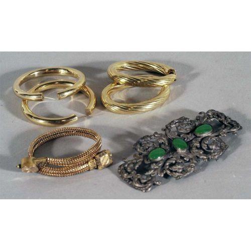 1 LOT OF JEWELRY including Victorian buckle and bracelet together with two pairs of 14kt gold earrings (34 grams) CONDITION REPORT: excellent. PACKING AND SHIPPING (excluding insurance) by Fairfield Auction to points within the Continental U.S.A. and Canada (all other international must be handled by 3rd party shipper) $20.