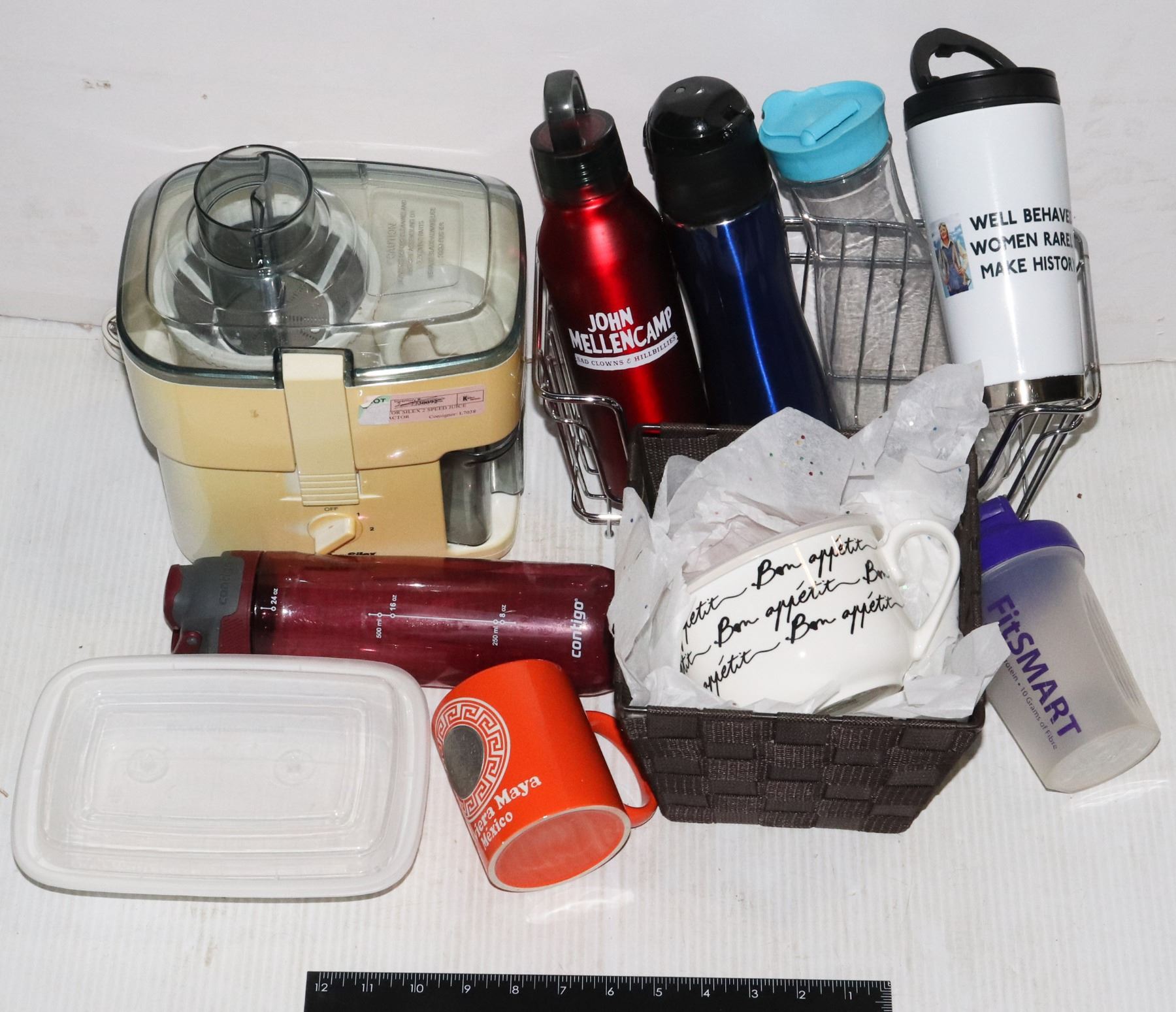 LOT OF USED KITCHEN ITEMS , CUPS, WATER BOTTLES JUICER AND MORE