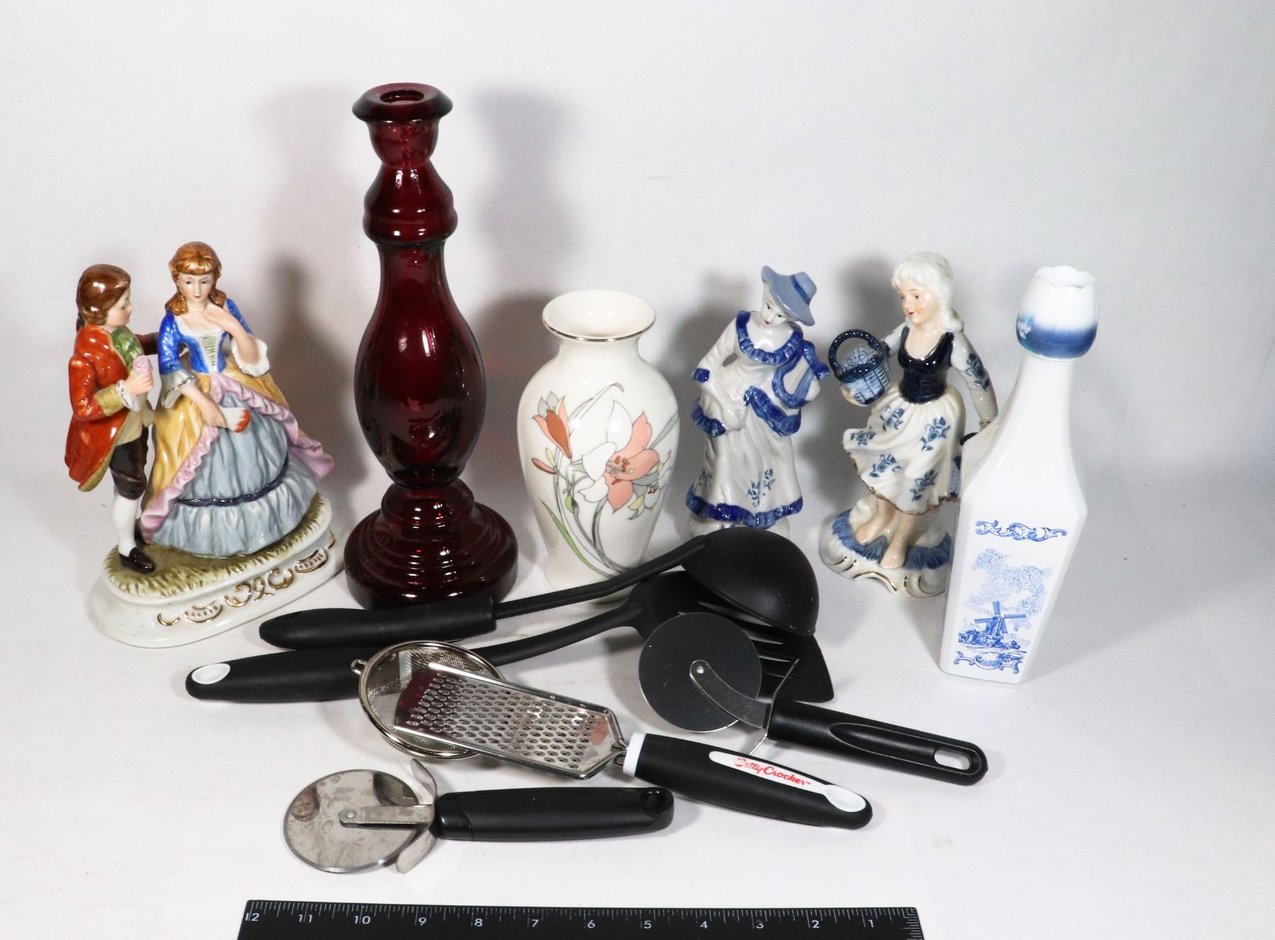 LOT OF KITCHEN TOOLS AND FIGURINES ETC