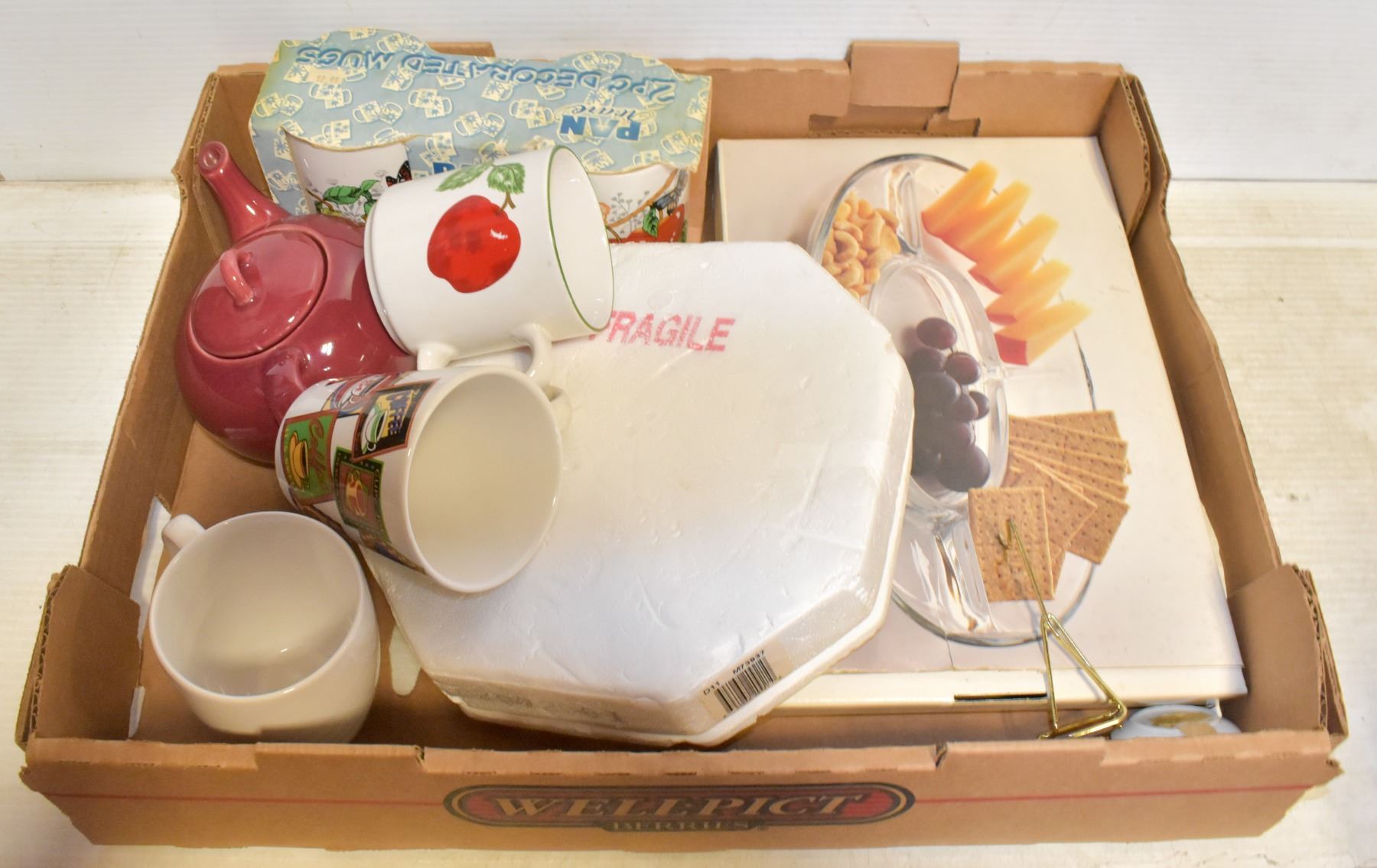 TEAPOT, 5 SECTION GLASS SERVING PLATE, COLLECTOR KITTY PLATE, 5 MUGS