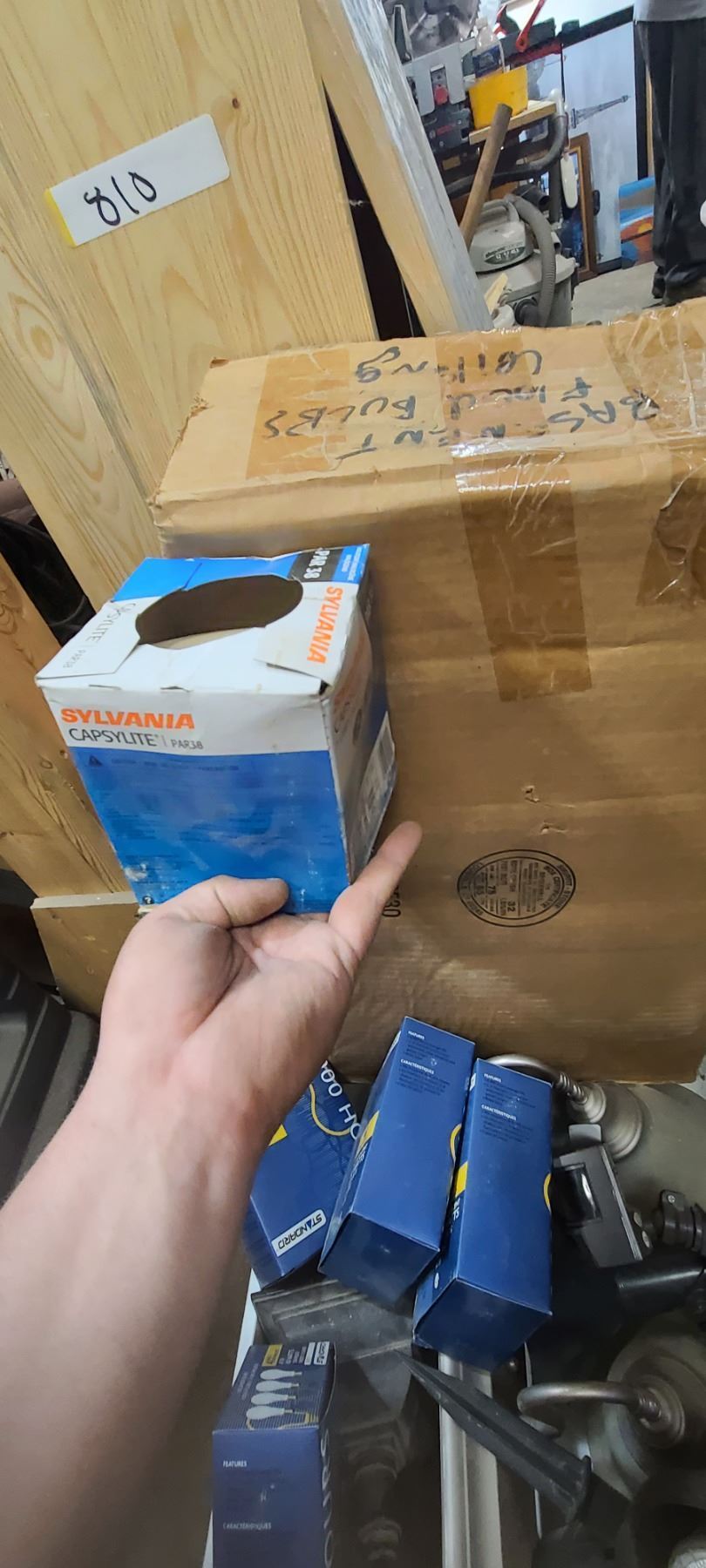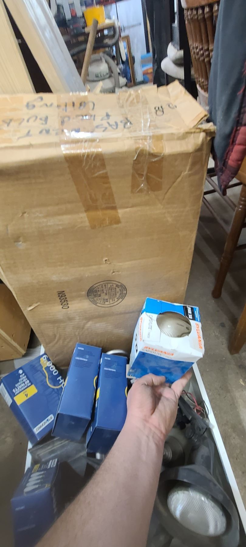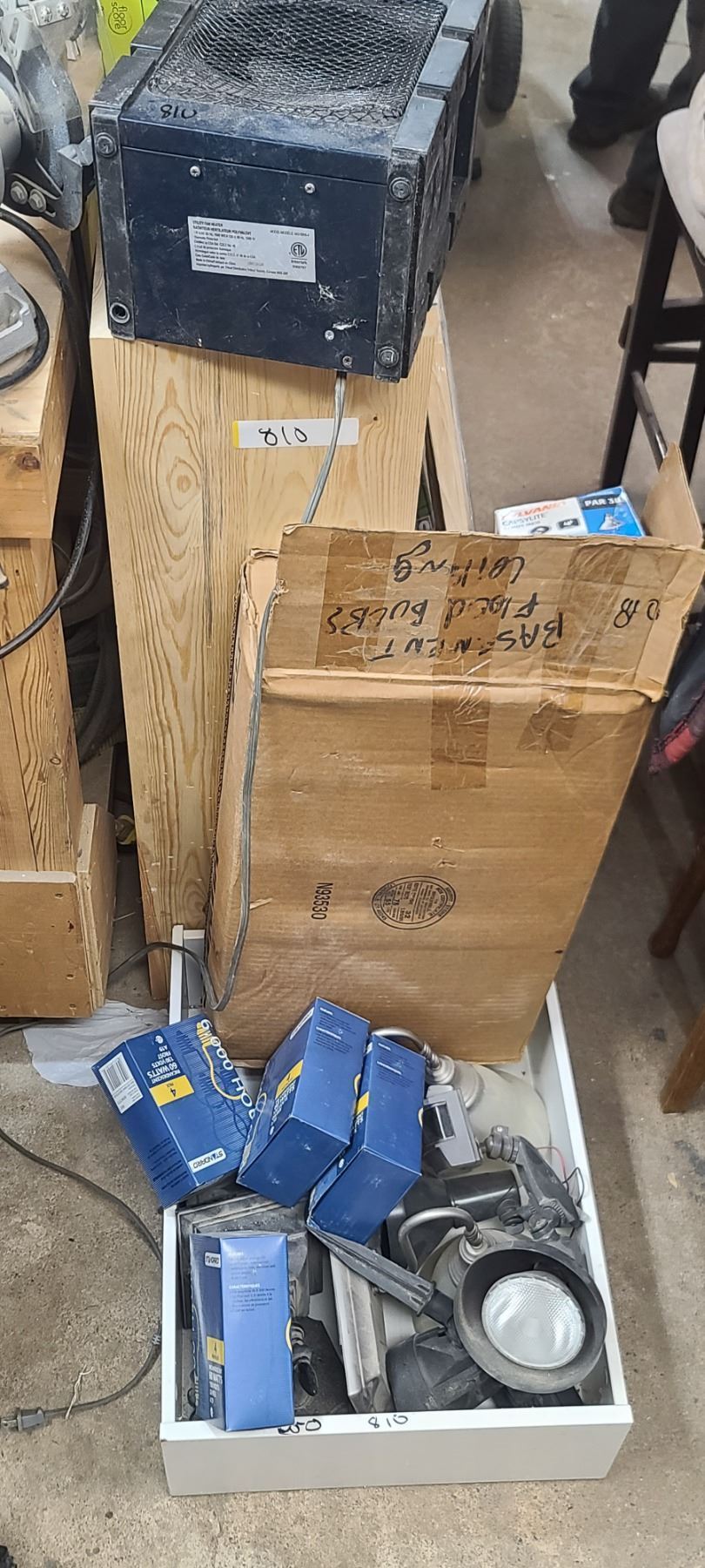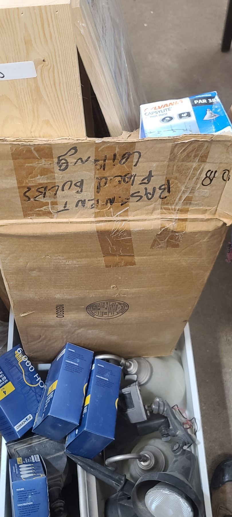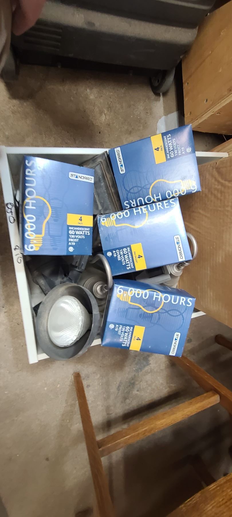 LOT OF LIGHT BULBS, FIXTURES, HEATER AND WOOD BOX