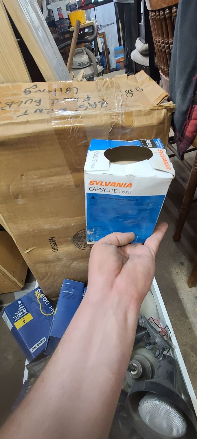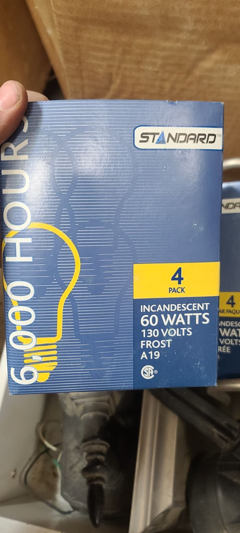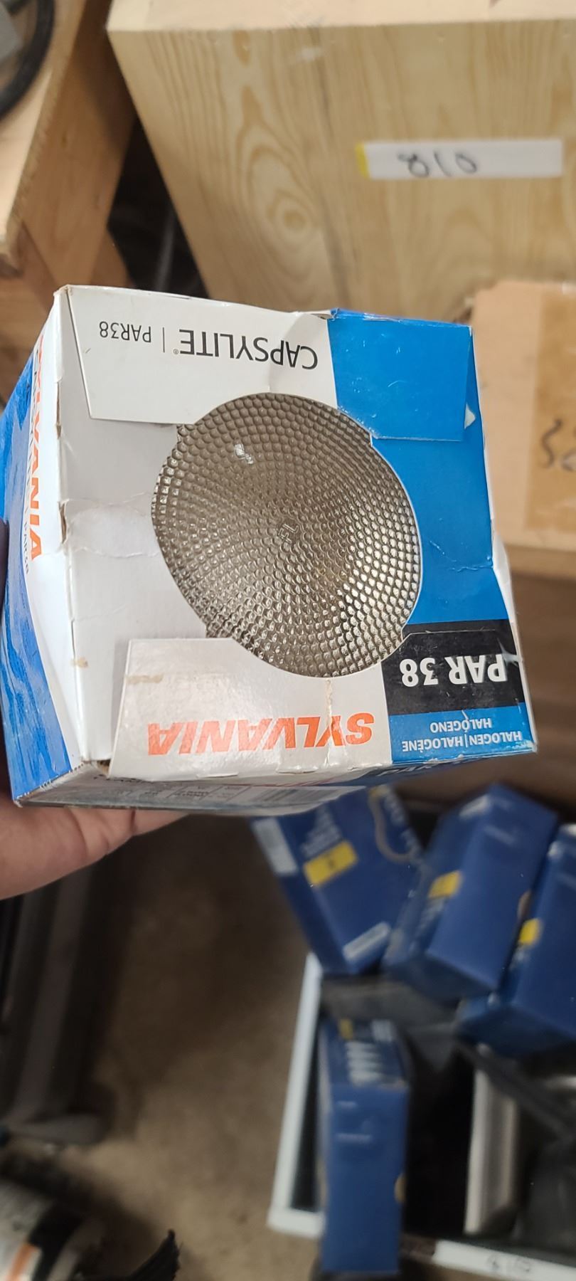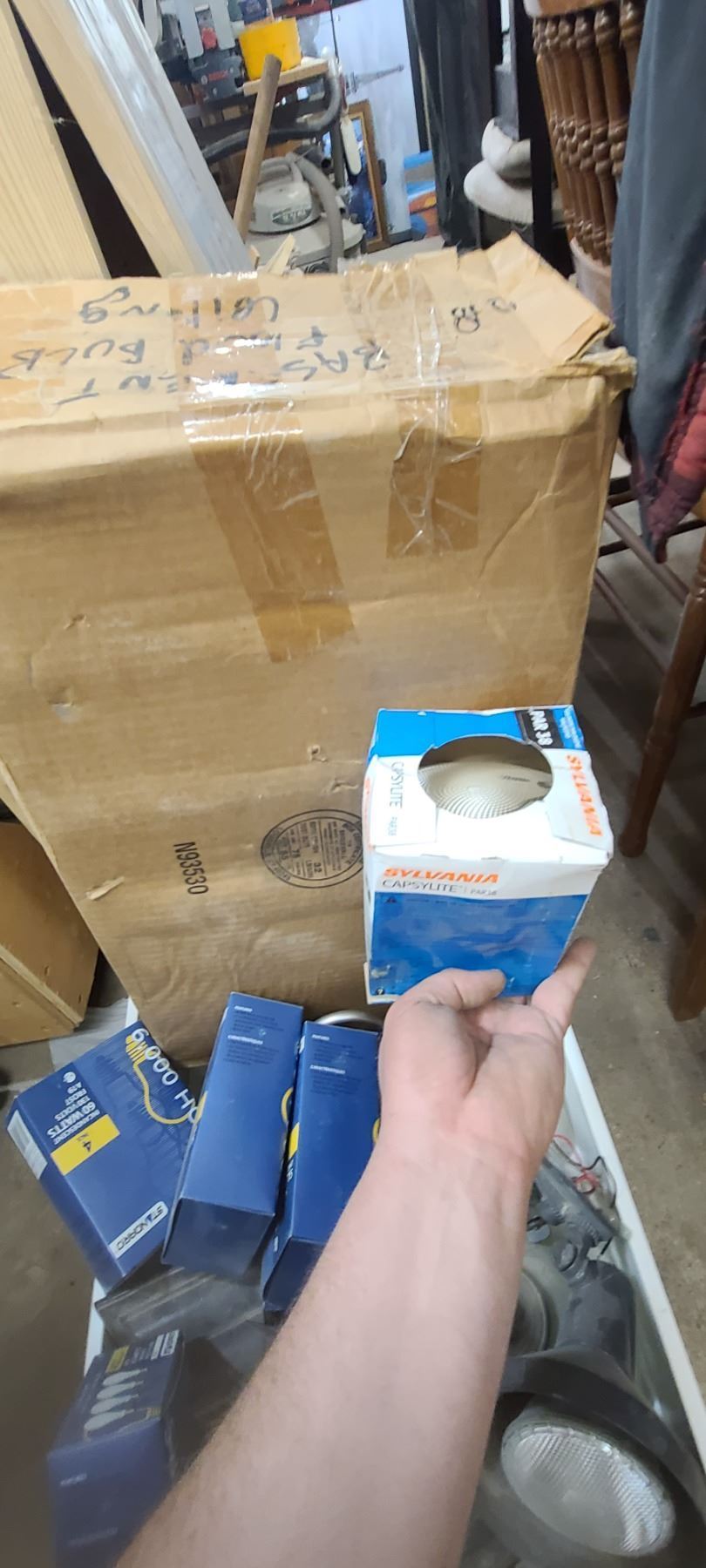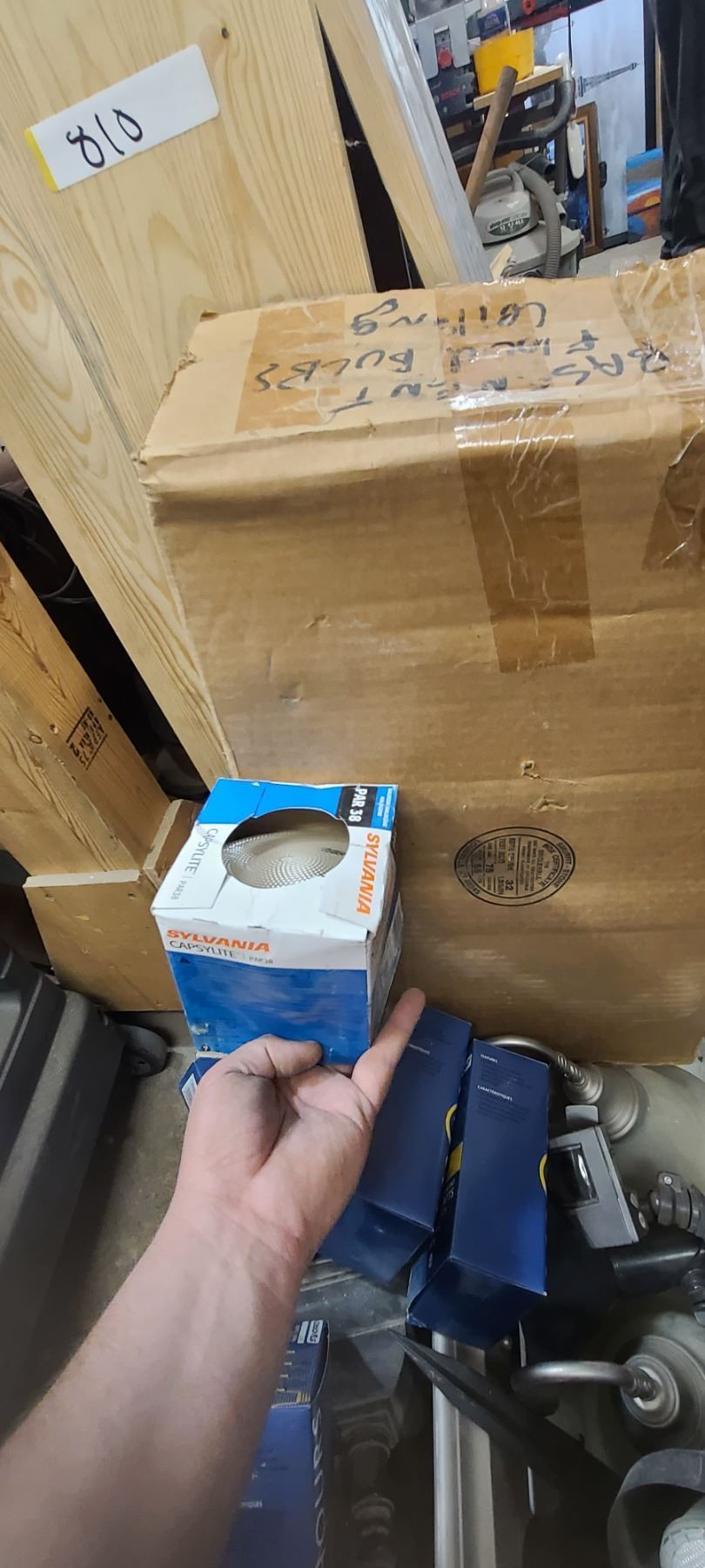 LOT OF LIGHT BULBS, FIXTURES, HEATER AND WOOD BOX