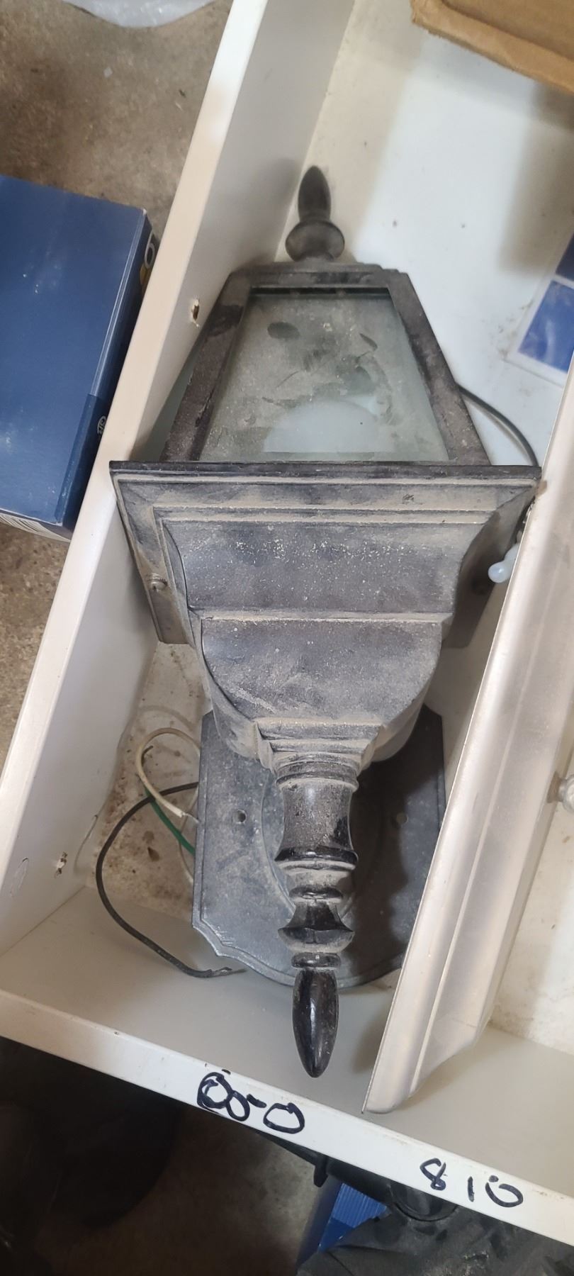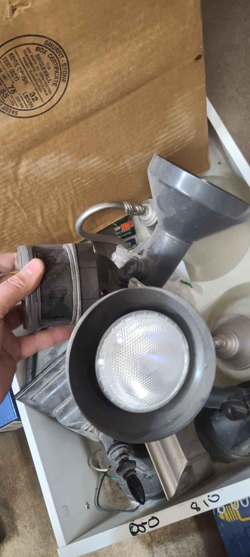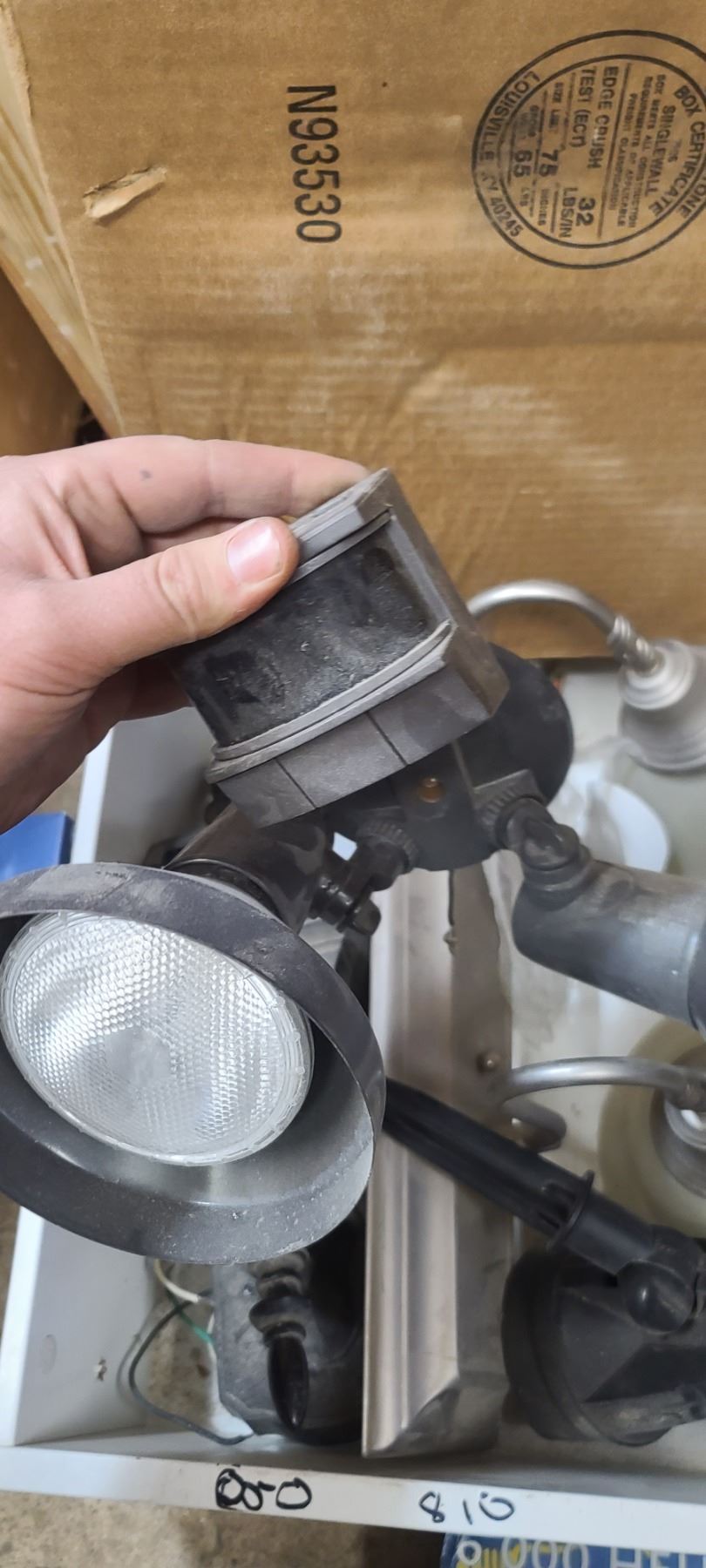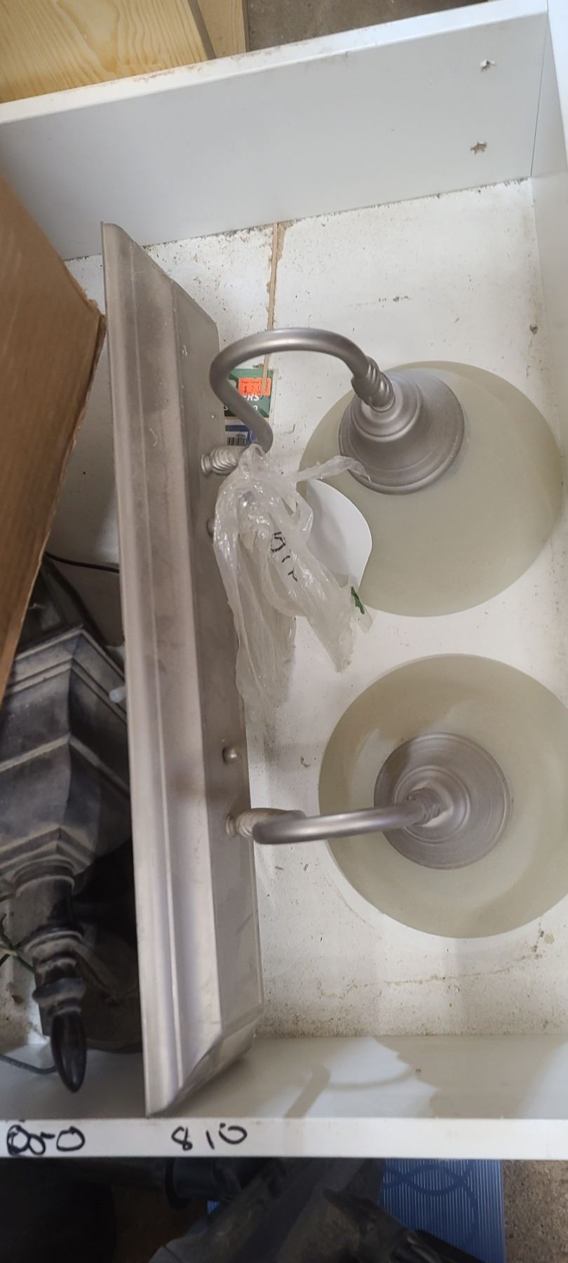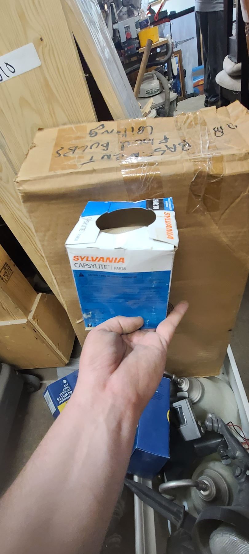 LOT OF LIGHT BULBS, FIXTURES, HEATER AND WOOD BOX