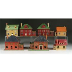 LOT OF LIONEL ACCESSORIES. Lot includes five villas and two bungalows, all made of tin. Two #21 villas have red brick sides and dark gray roofs; two #191 villas have dark red speckle finish with green roofs; one #189 villa painted yellow cream with light green roof, terra-cotta chimney. Painted bungalow is marked #21 on green base, painted tan with orange roof; other bungalow is painted cream with red roof and brick chimney, no base. CONDITION: From average to very good. EC 1-4391 (500-850)