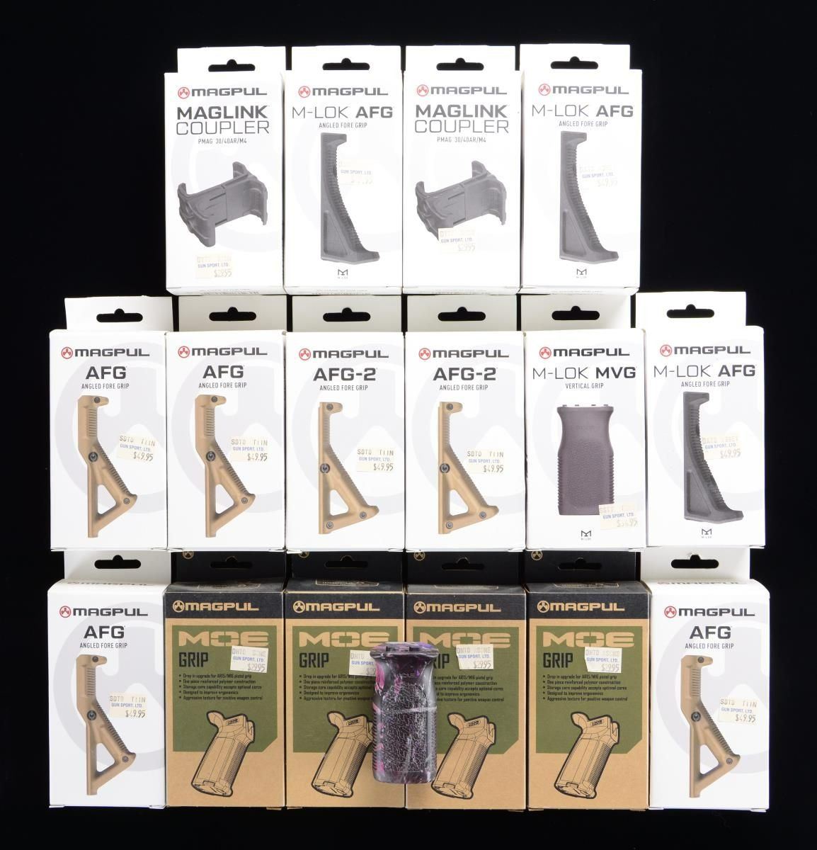 Several Magpul accessories including the following; 1) 4 MOE Pistol Grips. Part # MAG415-FDE. 2) 4 AFG Angled Fore Grips. Part #MAG411-FDE. 3) 2 AFG-2 Angled Fore Grips. Part #MAG414-FDE. 4) 3 M-LOK AFG Angled Fore Grips. Part #MAG598-BLK. 5) 2 MAGLINK Coupler. Part #MAG595-BLK. 6) 1 M-LOK MVG Vertical Grip. Part #MAG597-BLK. CONDITION: All parts appear to be new, in factory retail packaging. PROVENANCE: The Collection of Gun Sport Ltd owned by Jon R. Thomas. (02-20847-2/JZ) $400-600.
