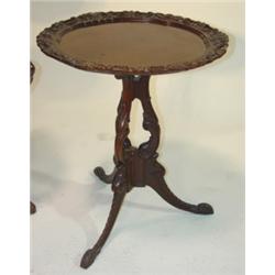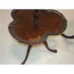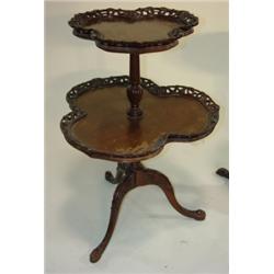 Lot of 2 mahogany stands consisting of 2 tiered dumbwaiter and stand. Dumbwaiter is in need of refinishing. 33.5" H. Stand: 27.5" H, 22.25" Dia.