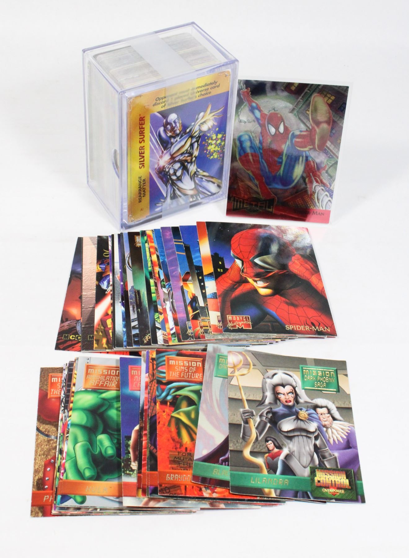 MARVEL OVERPOWER CARD GAME 1997 IN CASE, MARVEL METAL BLASTER SPIDER-MAN CARD 1995, MARVEL MASTERPIECES CARDS LOT OF 25 CARDS, AND MORE