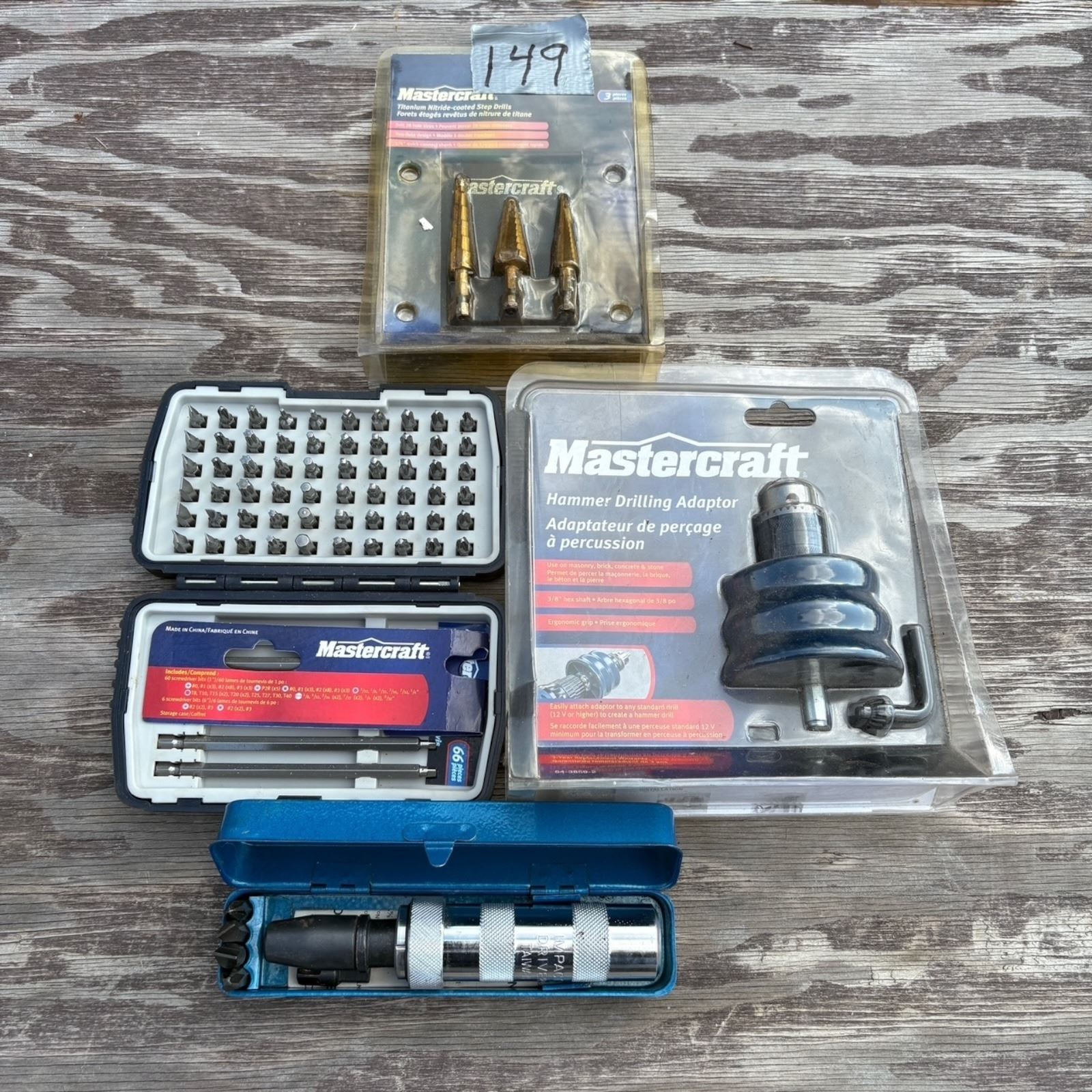 hammer drill / adaptor, 3 piece titanium drills, 66 piece screw driver bit set, impact driver