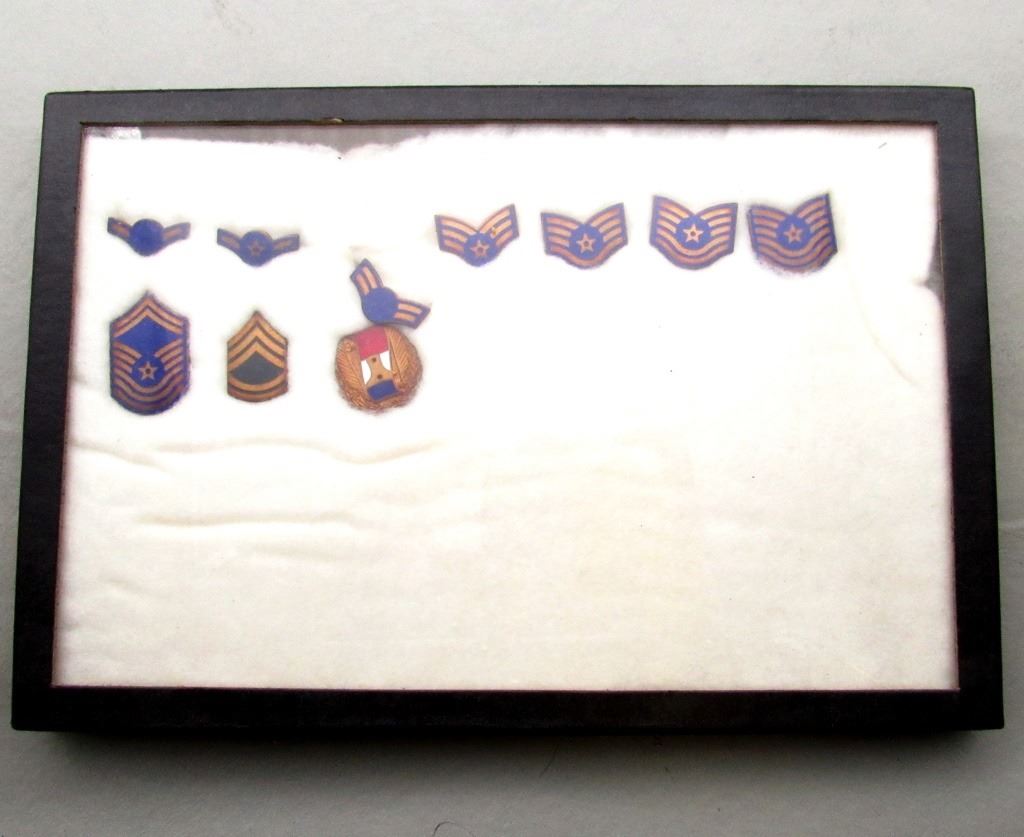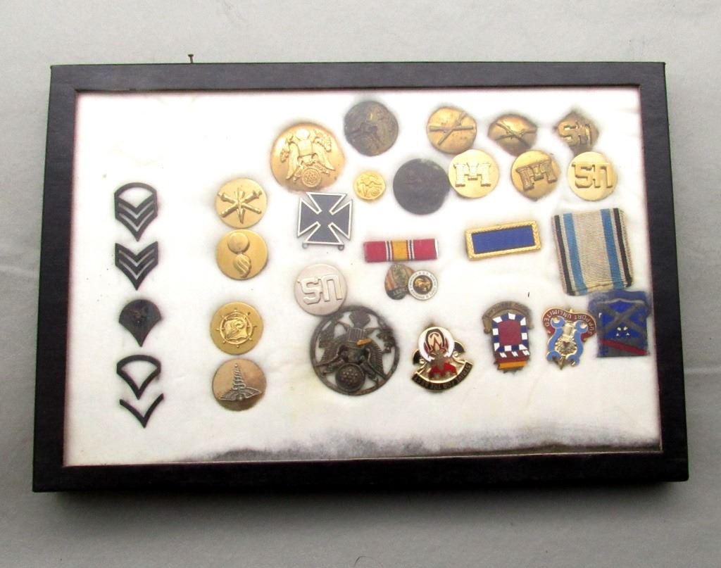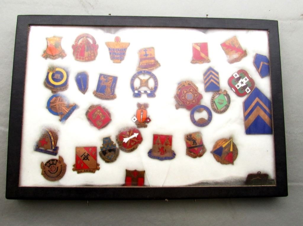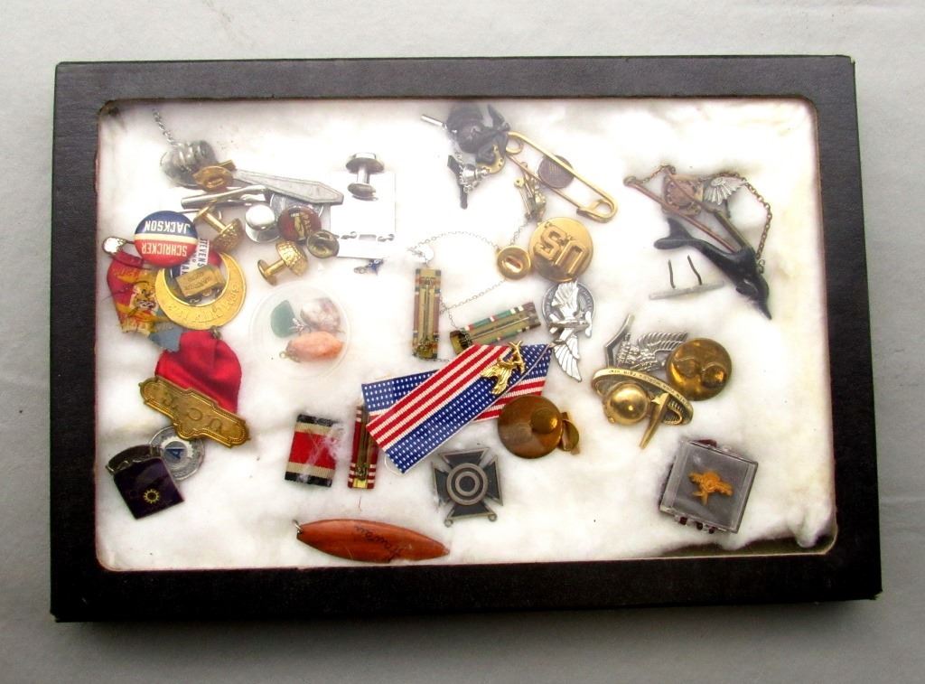 PIN LOT. DATE AS OLD AS WWII AND FORWARD. (4) DISPLAY CASES INCLUDED. UNIT CRESTS, LAPEL INSIGNIA, RANK, POST WWII AIR FORCE RANK PINS, AND OTHER MILITARY PINS. ALSO INCLUDED ARE SOME OTHER ODDS AND ENDS ITEMS. ONE OF