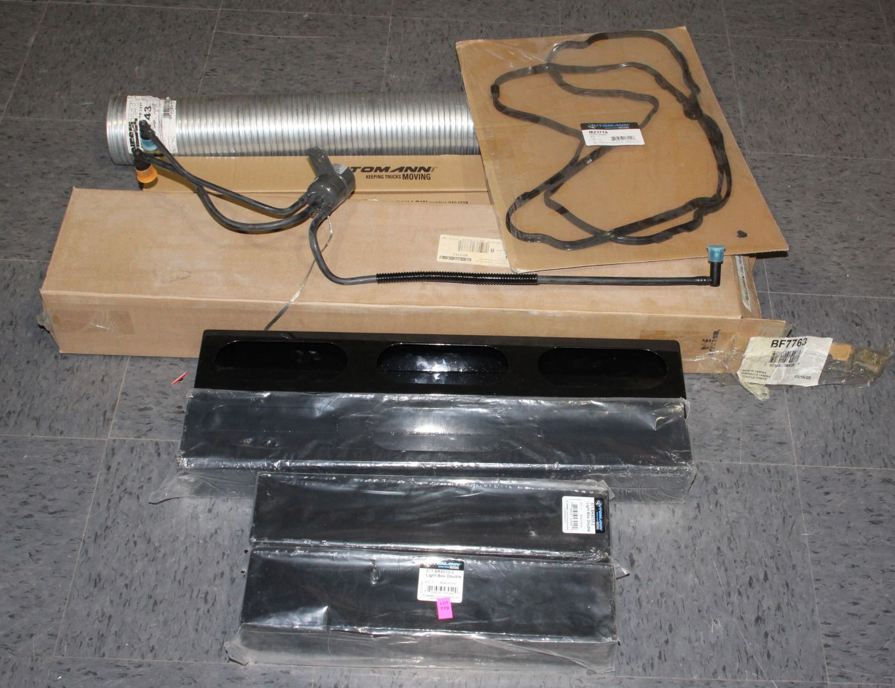 36" EXHAUST FLEX TUBE, IOL PAN GASKET M23719 (DAMAGED PACKAGING), AUTOMANN TRAILER LIGHT BOXES, AND FILTER BF7763