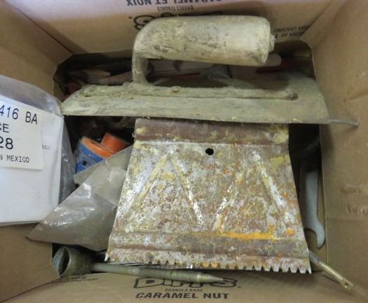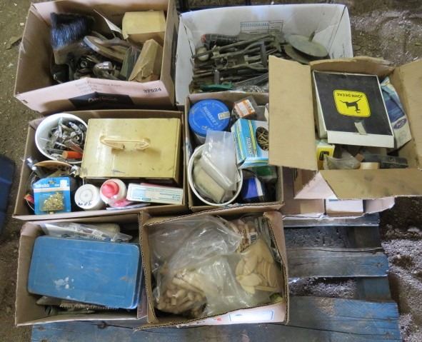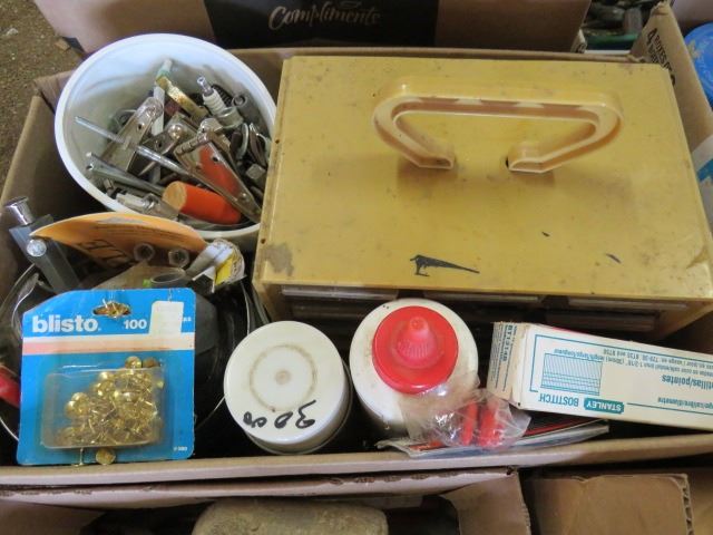 LOT OF MISC BUILDING SUPPLIES (FILES, CHISELS, PAINT SUPPLIES, SCREWS, BISCUIT JOINERS, NUTS AND BOLTS, ETC)
